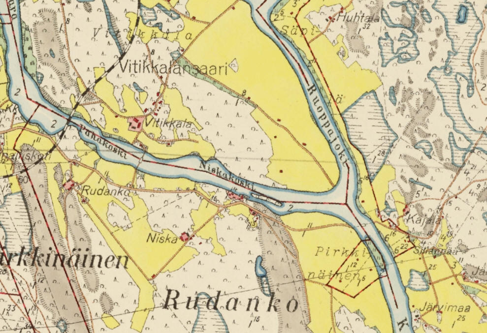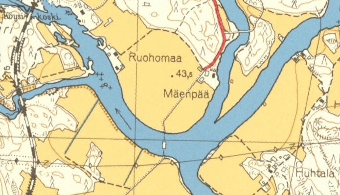 Riuttasalmi über den Pääjärvi 500m / ab 1953 (?): 310 m (Fährstelle ab 1894 ?) - Kartenlink - - https://vanhatkartat.fi 1964 (12-to-Fähre) |