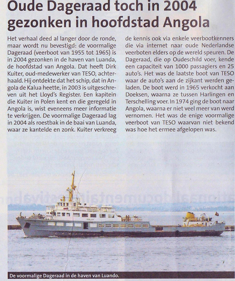 10.1955 Ablieferung 1955 - 1962 Den Helder - Oudeschild / Texel 1962 - 1965 Den Helder - 't Horntje / Texel 1965 - 1974 Harlingen - Terschelling 1966 aushilfsweise Den Helder - Texel 1974 nach Angola verkauft - 2002 noch existent Im Jahr 2003 wurde das Schiff aus Lloyd's Register gestrichen - Infoquelle und Bild unten - im Jahr 2004 kenterte die rostige Kalua und sank im Hafen von Luanda |