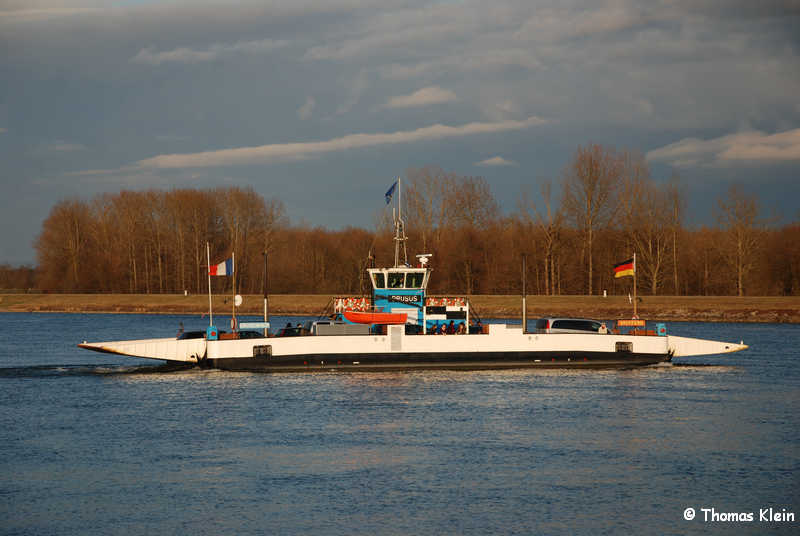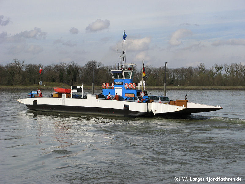 früher 2x MWM 115 PS - Diesel auf Schottel Ruderpropeller ab 1997: 2 Dieselmotoren mit je 306 PS auf 2 x Schottel Pump-Jet Schwesterschiff der "Rhinowe" von 1967 Schiffsbrücke bis 1961, dann Hochseil-Gierfähre Einsatz der "Drusus" ab 17.8.1977 ! in Schiffsliste Auftraggeber: WSA Freiburg, da an der Finanzierung beteiligt Die Fährfahrt ist kostenlos. |