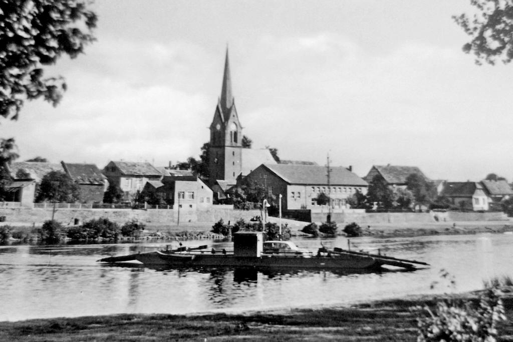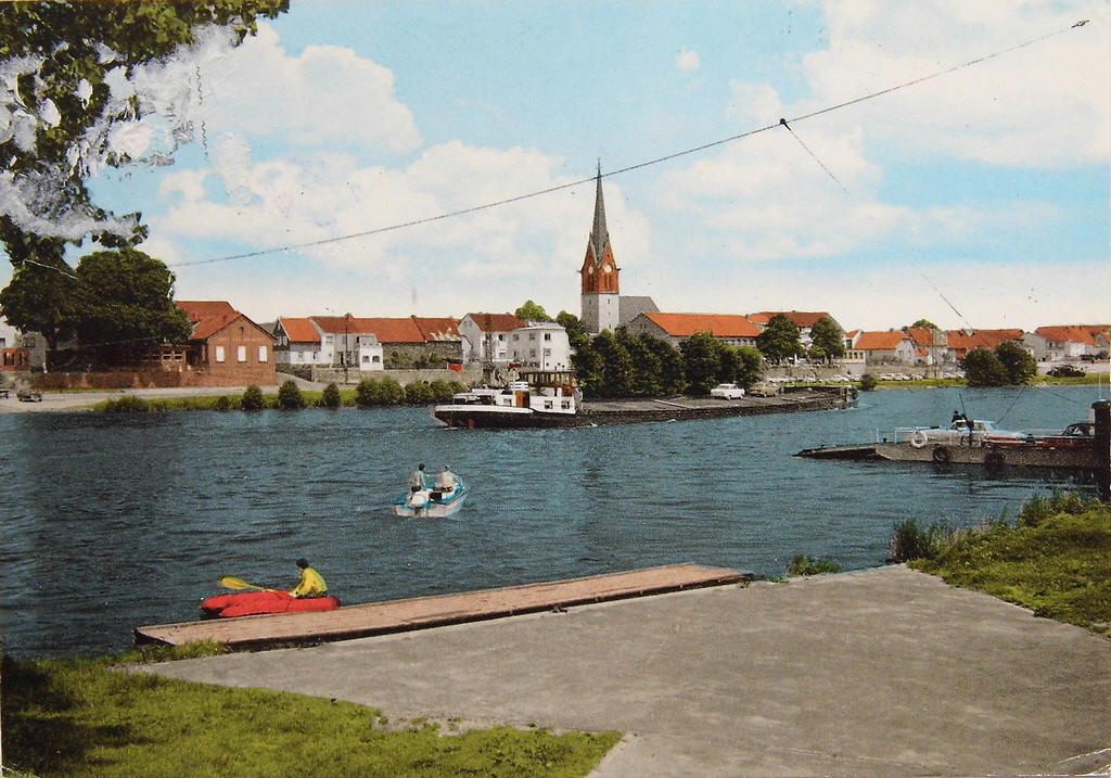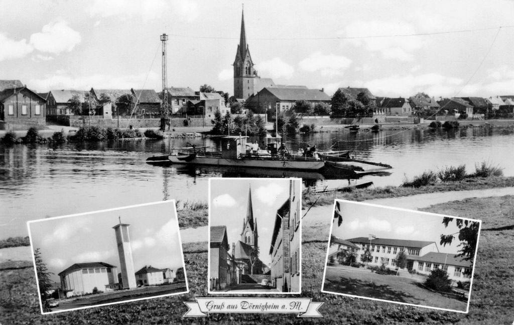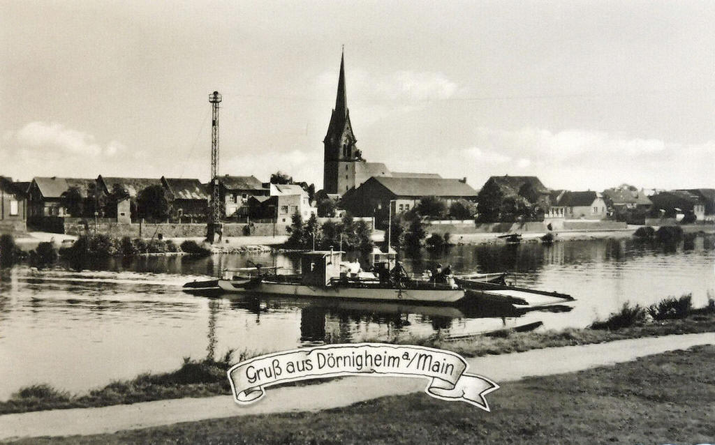 Reparatur der Fähranlage und Neubau einer Fähre: in der Bauliste der Bayrische Schiffbaugesellschaft m.b.H., Erlenbach ist für 1945 als Bau.-nr: 800 eine 25-to-Fähre für H. Schäfer, Dörnigheim verzeichnet. "Es war eine elektrisch betriebene hochseilgeführte Oberleitungsfähre mit Seilnachen. Die Stromzuführung erfolgte über ein separates Oberleitungsseil, montiert an zwei zusätzlichen Masten, ca. 10 Meter flussabwärts von den Masten des Führungsseils." Info von Ulrich Weis |