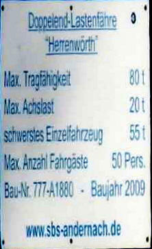 | 80 | Tonnage | 45 | m lang | 9,5 | m breit | 1 | m Tiefg. | -50 | Passagiere | - | PKW | 13 | km/h | |