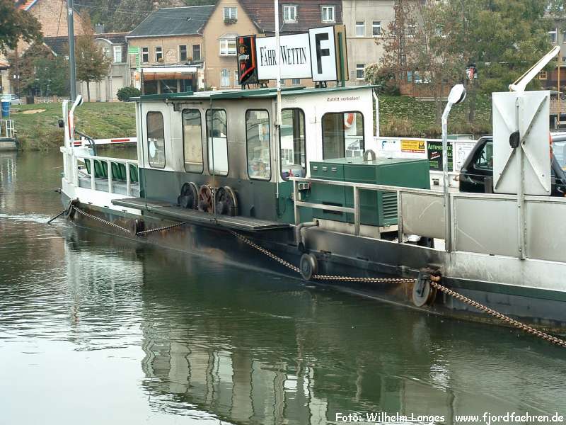 Buchtnachen, 1997 umgebaugt zur Hochseil-Gierfähre ab ca. 2003 Umrüstung auf Grundkettenantrieb durch Elektromotor, weiter am Hochseil geführt https://www.fähren-wettin-löbejün.de/ |