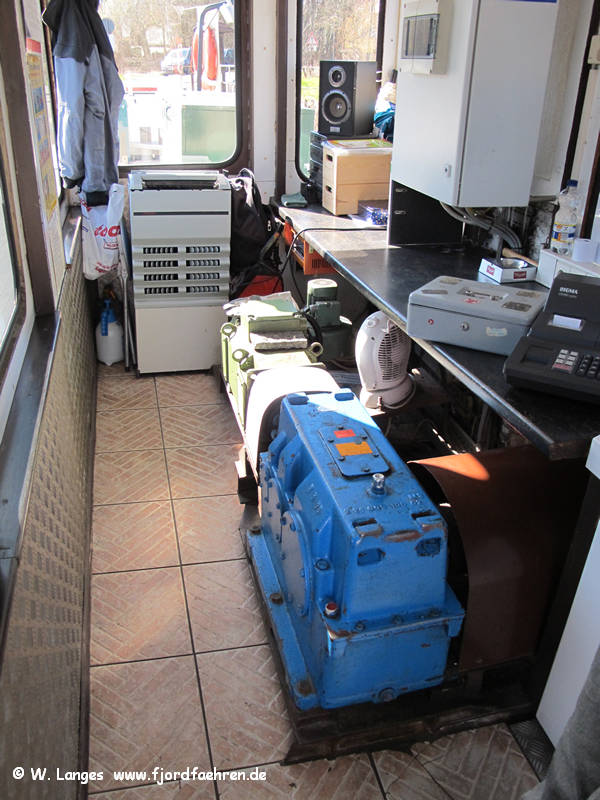 Stromversorgung für den Elektromotor (grüne Einheit) hinter dem Getriebe (blau) Die Fähre wird seit ca. 2003 elektrisch angetrieben. |