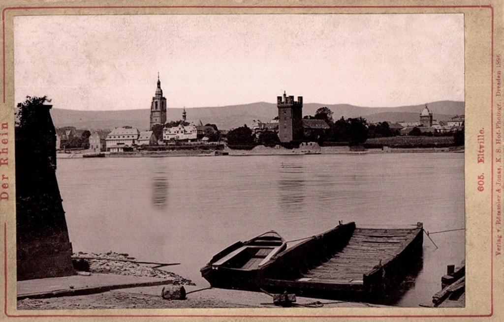 ca. 1950er Jahre: Luftaufnahme vom Eltviller Ufer mit Fährrampe und Fährprahm