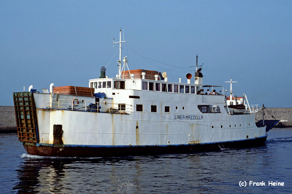/ operationarea / innsatsområde: 1955 - 1959 Svendborg - Ærøskøbing 1959 - 1966 Palau - La Maddalena - Santa Teresa Gallura (Sardinia) 1966 - 1978 Piombino - Portoferraio (Elba) zwischenzeitig Liberia-Flagge bis 11.2002 1978 - 2005 Terracina - Isola di Ponza - Verkehr ab 2011 für Nuova Naviservice SRL, Neapel Terracina - Isola di Ponza / Terracina - Isola di Ventotene (als Frachtfähre) 01.2019 AIS-Signal |