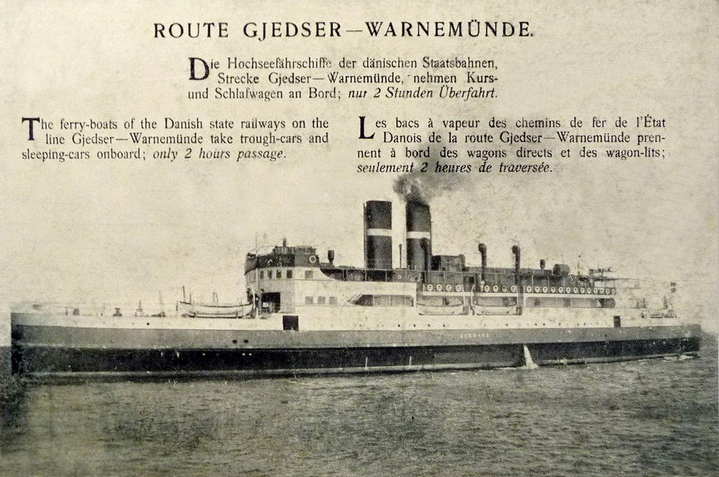 | "DANMARK" Stapellauf: 07.12.1921 Ablieferung: 11.12.1922 Bauwerft: Helsingørs Skibsværft & Maskinbyggeri A/S., Helsingør Baunummer: 163 BRT: 2727 / ab xxxx; 2915,36 NRT: 1094 / ab xxxx: 1264,12 TDW: 650 Länge: 101,72 Breite: 18,75 Tiefgang: 4,50 Knoten: 15 - 16 PS: 3500 (3600) / 2760 PSi KW: 2572 Antrieb: 2 X 3-zyl.-Helsingørs MSK- Dampfmaschine mit je ca. 1800 PS Passagiere: 1100 Kabinen: 12 PKW: 70 komb. Fahrzeug- und Eisenbahnfähre, 3 Gleise mit zus. 157 m Gleislänge Waggons: 20 Signal: NDTG / (OXDA) OXDS Registernummer: A 85 Daten: Jürgen Stein, Hamburg = Ergänzungen |