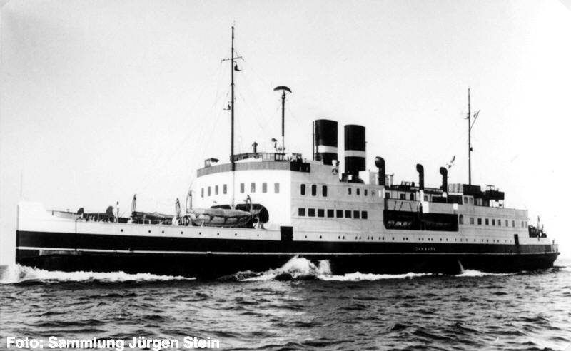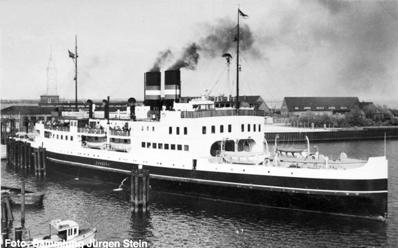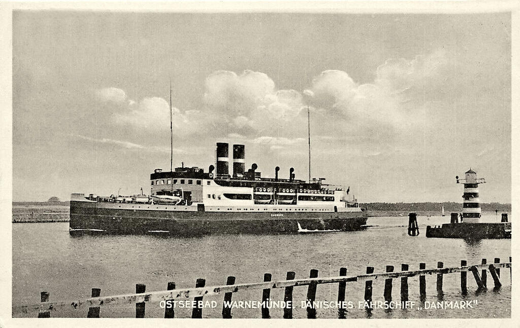 - 12.12.1922 - 17.03.1945: "DANMARK" Eigner: Det Danske Statsbaner- DSB., København Liniendienst: Gedser - Warnemünde Bemerkung: 09.01.1944: Kollision mit der "SCHWERIN" in Warnemünde 17.03.1945: Durch einen Sprengstoffanschlag am Fähranleger in Gedser versenkt. 22.03.1945: Abgeborgen und nach København geschleppt. 23.03.1945 - 10.05.1947: "DANMARK" Eigner: wie oben Werftliegezeit bei Burmeister & Wain`s Maskin- og Skibsbyggeri A/S, København 11.05.1947 - 13.05.1963: "DANMARK" Eigner: wie oben Liniendienst: Gedser - Warnemünde und Grossenbrode Kai - Gedser Bemerkung: 01.03.1949: Kollision mit dem Fähranleger in Warnemünde. Es entsteht ein Gesamtschaden von 59000 Mark 14.05.1963 - 14.04.1968: "DANMARK" Eigner: wie oben Liniendienst: Warnemünde - Gedser 15.04.1968 - 18.04.1968: "DANMARK" Eigner: wie oben Auflieger in Gedser 18.04.1968 - 00.00.1968: "DANMARK" Eigner: Heyghn Freeres S.A., Gent 23.04.1968: Im Schlepp Ankunft in Brügge zum Abbruch. |
