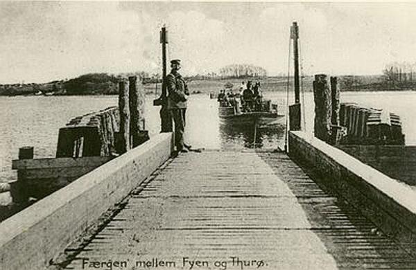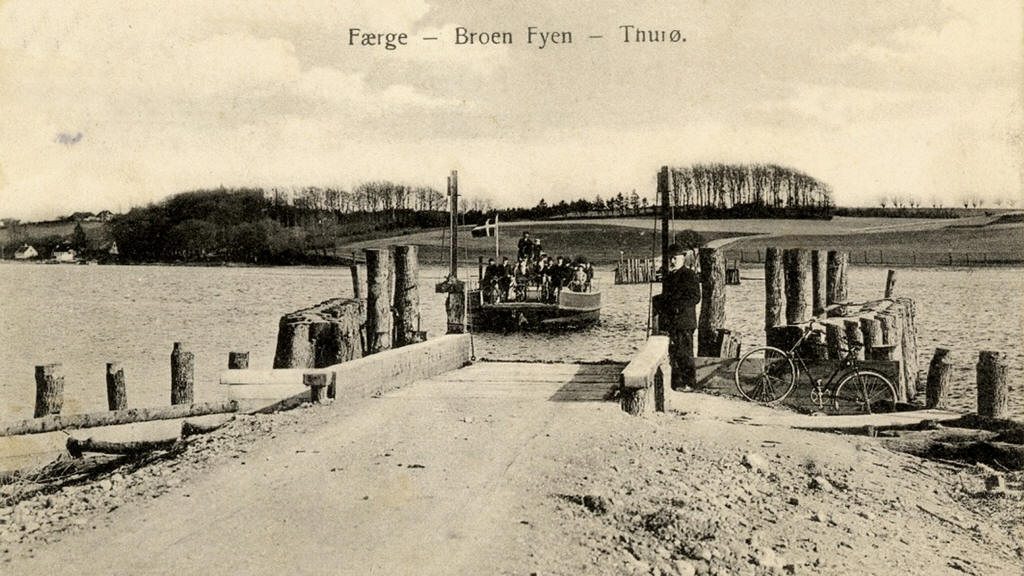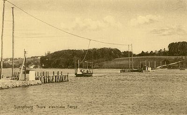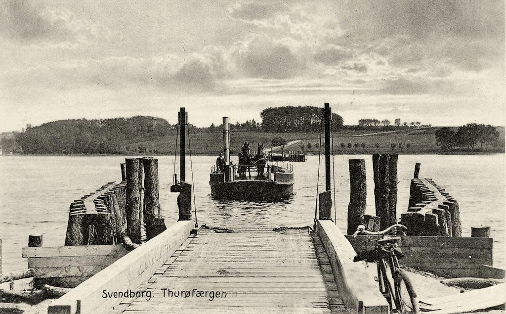 KULTURHISTORIE Trækfærgeforbindelsen mellem Nordodde på Thurø og Bjørnemoseløkken på Fynssiden er blot én blandt flere forbindelser, der gennem tiden har været mellem Thurø og Fyn. Joller varetog persontransporten igennem mange år, hvorimod køer og heste under kyndig vejledning selv måtte svømme over Skårup Sund. Dampbåde og senere motorbåde afløste jollerne i slutningen af 1800 - tallet, og kreaturerne kunne fra da blive fragtet over, tørbenede. Trækfærge - forbindelsen blev oprettet i 1908 af en den lokale murermester Jørgen Larsen. Færgen var en kabelfærge, der blev trukket over sundet med et håndspil anbragt på færgen, og koblet til en kæde, der lå på havbunden. Håndspillet blev hurtigt skiftet ud med et motordrevet, og i 1911 blev motoren ombyttet med en eldrevet, som blev brugt indtil trækfærgens nedlæggelse i 1934. På Fynssiden skulle der efter sigende have været et ringeappa rat, som man kunne trykke på og hidkalde færgen, hvis den lå ved Thurø. Mogens Larsen stod også bag opførelsen af Færgegården i 1919. Den var oprindeligt inddelt i to lejligheder indtil 1925, hvor murermester og trækfærgeejer Larsen og familie tog hele huset i brug. I 1934 blev broen og dæmningen til Thurø indviet, og murermester Larsen måtte nedlægge trækfærge-forbindelsen. Færgegården blev samme år solgt. Textquelle: http://svendborg.cowi.webhouse.dk/download/temaer/kulturarv/Uddybende_beskrivelser/thuroe_faergested_uddybende_kulturmiljoebeskrivelse.pdf |
