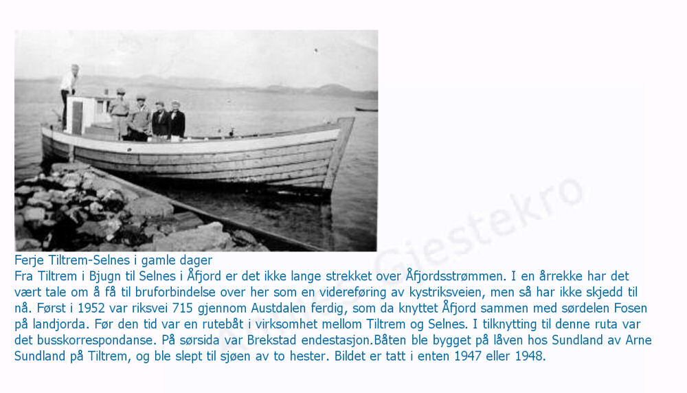"Arne Sundland hadde da bygd en pram som kunne frakte biler, ... En litt større pram ble bygd etter at den første sank under et oppdrag for Lysøysund sildoljefabrikk. Fram til opphør rundt midten av 1950-tallet skal det ha vært fraktet ca. 500 biler over strømmen." |