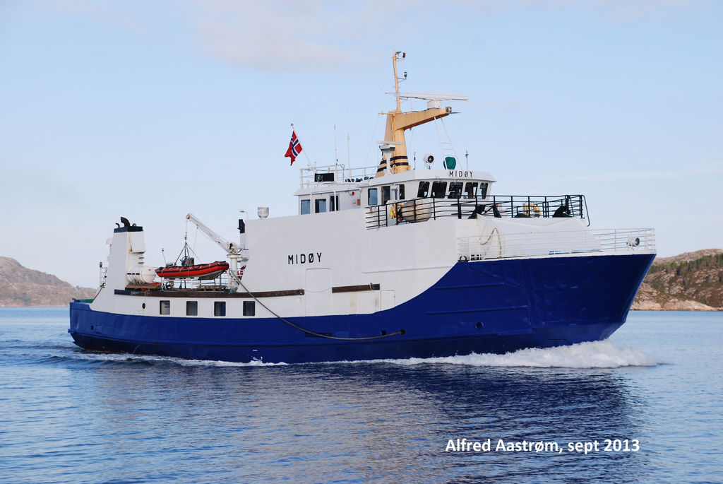ferje i Ona-ruten Mange husker «Midøy» som var ferje i Ona-ruten i perioden 1989-2012. En god og sikker sjøbåt i en krevende rute når det var dårlig vær. Ferja ble bygd i 1968 ved Ulstein Mek. Verksted for partsrederiet Midøy/Arent Nygård på Midøy. Den ble leid ut til MRF som brukte den i forskjellige ruter rundt om i Møre og Romsdal. Senere kjøpte fylkesrederiet ferja. I 1983 ble den ombygd med lukket baug. Den siste perioden i Ona-sambandet fikk den en liten innebygd salong for 10-15 passasjerer bak rorhuset. I 2012 overtok «Kvaløy» fra Torghatten Nord Ona-ruten. «Midøy» ble da solgt. Her er et bilde av «Midøy» ut fra Ona ferjekai sommeren 2008. |
