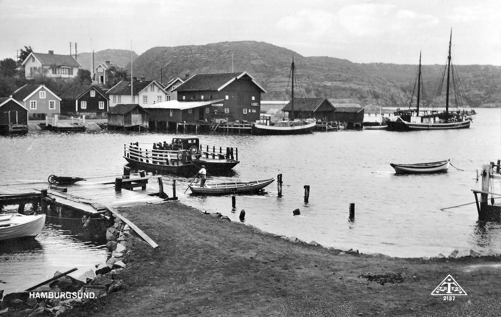 ![]() 1930er (1937 ?) Jahre Hamburgsund https://digitaltmuseum.se/021018111041/farjepram-med-folk-och-bil |