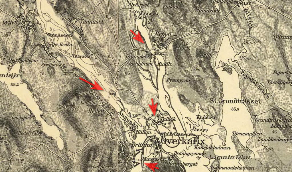 Nybyn - Storholmen Tallvik - Överkalix Färja Tallvik nn - Färja 62/107: 1932 - 1956 Kangis - Överkalix (nicht mehr in Karte 1940) - Färja nn ?? Svartbyn - kleine Ruderfähre - Färja nn: Bohedenleden - Färja 62/108: 1940 - 1950 - Färja 62/109: 1950 - 1956 - Färja 62/107: 1956 - 1960 - Färja 62/159: 1960 - 1979 - Färja 62/240: 1979 - 2002 - Färja 62/312 - Paulina: 2002 - ... - an Land liegt eine Drivenhet Heden - Tallvik über den Ängesån (nahe der Mündung in den Kalixälven bei Överkalix) Färja nn: (Brück in Karte 1940) |