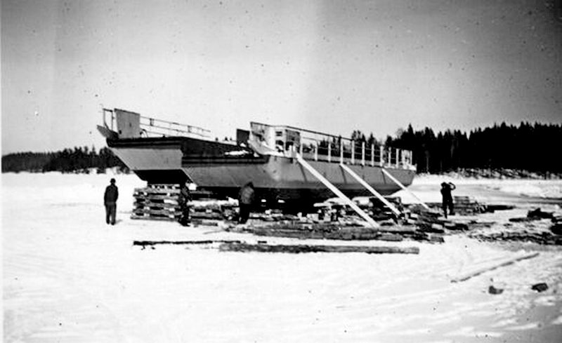 ![]() 1950er Jahre: Niilo Kiirikki, v. Zusammenbau der Putaansalmen lossi https://www.finna.fi man sieht deutlich die zwei Hälften der Fähre. Dieses System ermöglich den Landtransport der Fähren |