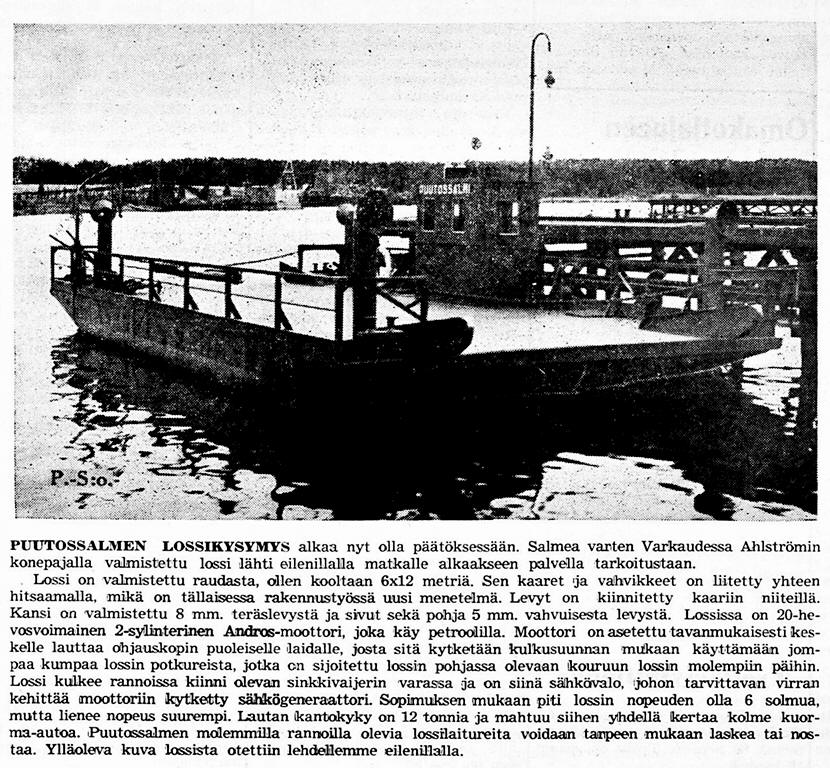 PUUTOSSALMEN LOSSI 1939 - 1953 (?) propellergetriebene 12-to-Stahl-Seilfähre Ahlström Oy, Varkaus 1939 B.-nr: 645 Länge: 12 m Breite: 6 m 12 to-Tragfähigkeit - 20-PS-Androsmotor ca. 6 kn |
