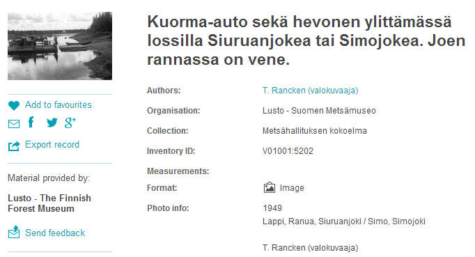![]() 1949 - Ein Lastwagen und ein Pferd überqueren mit einer Fähre den Fluss Siuruanjoki oder Simojoki T. Rancken, Fotograf / Lusto - The Finnish Skogsmuseum https://www.finna.fi CC BY 4.0 ![]() |
