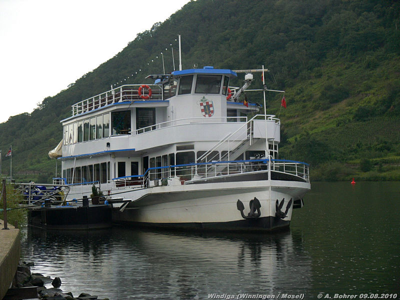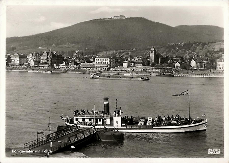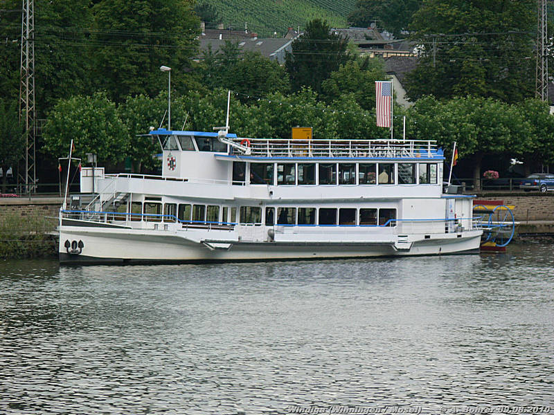 und früherer Fähreinsatz: 01.1902 - 20.4.1929 Königswinter - Bad Godesberg-Mehlem; Rhein Spitzname: "Schnecke" Ostern 1929 durch die "Königswinter (II)" abgelöst - ab 1930 Einsatz: St. Goar - St. Goarshausen; - Spitznamen: "Blindschleiche" 19.3.1945 versenkt Januar 1946 gehoben, bis 1947 durch Fa Ruthof aus Kastel und Helbach aus Oberlahnstein wieder aufgebaut ab 1947 wieder im Einsatz St. Goar - St. Goarshausen - ab 1959 als Reserveschiff z.B. bei Hochwasser 1962 Umbau zum Diesel-Motorschiff 2 x 100-PS-Dieselmotore 1978/79 Umbau zum Personenschiff bei Wilhelm Schmidt, Oberkassel 1979 - 1982 Fahrgastschiff, stationiert in Bonn (u.a. Bundesgartenschau 04.-10.1979) 04.-10.1980 verchartert für die Gartenbauausstellung "Grün 80" in Basel (Schweiz) 1982 - 2015 Fahrgastschiff in Winningen, Mosel
