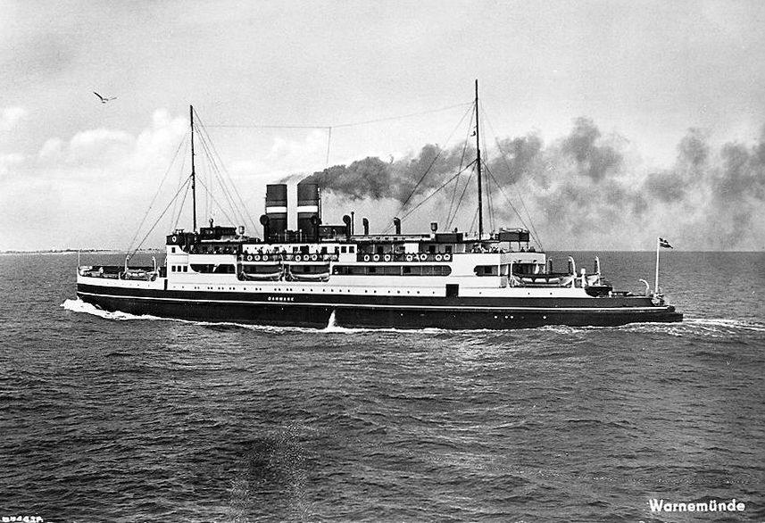 - 12.12.1922 - 17.03.1945: "DANMARK" Eigner: Det Danske Statsbaner- DSB., København Liniendienst: Gedser - Warnemünde Bemerkung: 09.01.1944: Kollision mit der "SCHWERIN" in Warnemünde 17.03.1945: Durch einen Sprengstoffanschlag am Fähranleger in Gedser versenkt. 22.03.1945: Abgeborgen und nach København geschleppt. 23.03.1945 - 10.05.1947: "DANMARK" Eigner: wie oben Werftliegezeit bei Burmeister & Wain`s Maskin- og Skibsbyggeri A/S, København 11.05.1947 - 13.05.1963: "DANMARK" Eigner: wie oben Liniendienst: Gedser - Warnemünde und Grossenbrode Kai - Gedser Bemerkung: 01.03.1949: Kollision mit dem Fähranleger in Warnemünde. Es entsteht ein Gesamtschaden von 59000 Mark 14.05.1963 - 14.04.1968: "DANMARK" Eigner: wie oben Liniendienst: Warnemünde - Gedser 15.04.1968 - 18.04.1968: "DANMARK" Eigner: wie oben Auflieger in Gedser 18.04.1968 - 00.00.1968: "DANMARK" Eigner: Heyghn Freeres S.A., Gent 23.04.1968: Im Schlepp Ankunft in Brügge zum Abbruch. |
