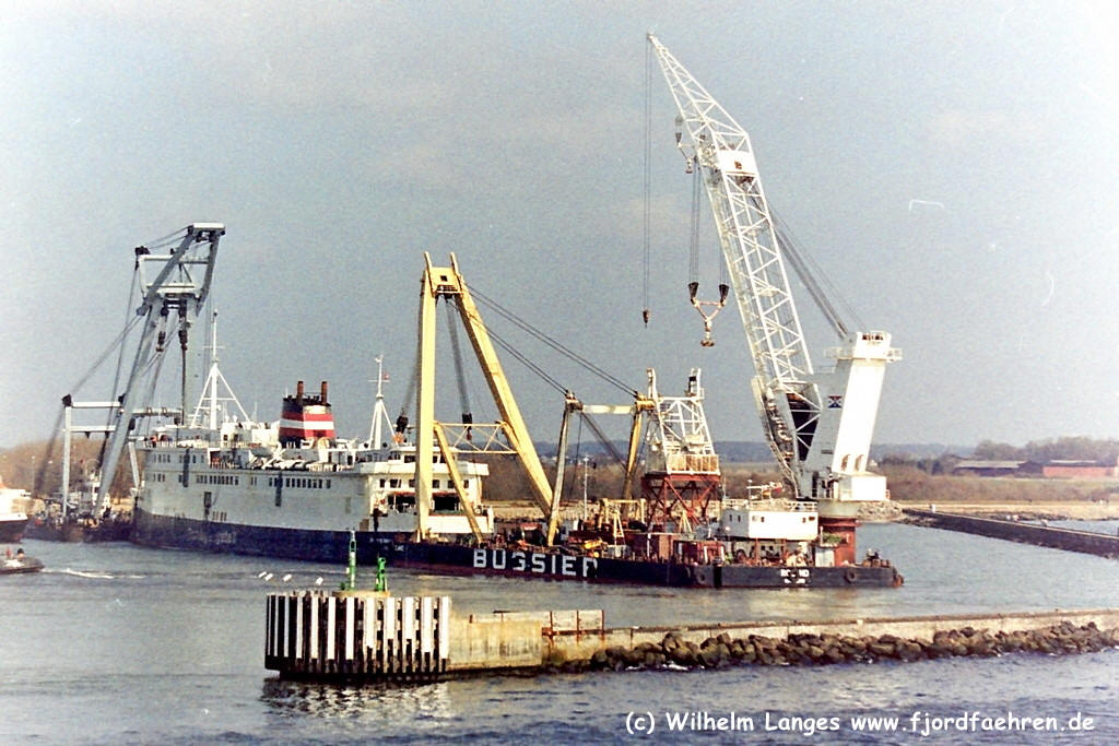 - 06.12.1973 - 02.03.1977: "DRONNING MARGRETHE II" Eigner: Det Danske Statsbaner- DSB., København Liniendienst: Nyborg - Korsør Bemerkung: 02.03.1977: Mit dem Expresszug "Sydvestjyden" und 250 Passagieren an Bord gerät das Schiff auf dem Großen Belt in Brand. Die Backbordmaschine fängt Feuer. Anschliessend brennt der ganze Maschinenraum aus. Die Abbergung der Passagiere und Besatzungsmitglieder erfolgt durch die Seenotrettungsschiffe "VEJRO" und "FREMAND 4". 03.03.1977 - 00.05.1977: "DRONNING MARGRETHE II" Eigner: wie oben Werftliegezeit zur Reparatur 00.05.1977 - 03.04.1981: "DRONNING MARGRETHE II" Eigner: wie oben Liniendienst: Nyborg - Korsør 04.04.1981 - 00.05.1981: "DRONNING MARGRETHE II" Eigner: wie oben Liniendienst: Puttgarden - Rødby Havn 00.05.1981 - 13.03.1982: "DRONNING MARGRETHE II" Eigner: wie oben Umbau bei Nakskov Skibsværft A/S., Nakskov 14.03.1982 - 03.04.1982: "DRONNING MARGRETHE II" Eigner: wie oben Liniendienst: Puttgarden - Rødby Havn 04.04.1982 - 12.04.1982: "DRONNING MARGRETHE II" Eigner: wie oben Liniendienst: Århus - Kalundborg 13.04.1982 - 16.04.1982: "DRONNING MARGRETHE II" Eigner: wie oben Liniendienst: Knudshoved - Halsskov 16.04.1982 - 22.04.1982: "DRONNING MARGRETHE II" Eigner: wie oben Werftliegezeit bei Svendborg Skibsværft A/S, Svendborg 23.04.1982 - 16.05.1982: "DRONNING MARGRETHE II" Eigner: wie oben Liniendienst: Nyborg - Korsør 16.05.1982 - 14.06.1982: "DRONNING MARGRETHE II" Eigner: wie oben Liniendienst: Knudshoved - Halsskov 16.06.1982 - 06.09.1982: "DRONNING MARGRETHE II" Eigner: wie oben Liniendienst: Puttgarden - Rødby Havn 07.09.1982 - 00.10.1982: "DRONNING MARGRETHE II" Eigner: wie oben Werftliegezeit in Frederikshavn Einbau eines Bugpropellers und einer neuen Dieselmaschine 00.10.1982 - 00.04.1989: "DRONNING MARGRETHE II" Eigner: wie oben Liniendienst: Puttgarden - Rødby Havn 00.04.1989 - 00.05.1989: "DRONNING MARGRETHE II" Eigner: wie oben Liniendienst: Århus - Kalundborg 00.05.1989 - 14.03.1991: "DRONNING MARGRETHE II" Eigner: wie oben Liniendienst: Puttgarden - Rødby Havn Bemerkung: 14.03.1991: Das Schiff kollidiert in dichtem Nebel mit dem RoRo-Schiff "BORE BRITANNICA". Eine Frau der Besatzung kommt dabei ums Leben. Nach der Kollision kommt es zu einem Brand, der allerdings schnell gelöscht werden konnte. Die 30 Passagiere und ein Teil der Mannschaft werden mit Rettungsbooten von Bord geholt. 15.03.1991: Da das Schiff zu sinken droht, wird es vor Rødby Havn vorsorglich auf den Strand gesetzt. Nach Überprüfung des Rumpfes läuft das Schiff den Hafen von Rødby Havn an, wo die Eisenbahnwaggons entladen wurden. 16.03.1991 - 00.07.1991: "DRONNING MARGRETHE II" Eigner: wie oben Reparatur bei Fredericia Skibsværft A/S, Fredericia 00.07.1991 - 30.09.1995: DRONNING MARGRETHE II" Eigner: wie oben Liniendienst: Puttgarden - Rødby Havn 01.10.1995 - 00.04.1997: "DRONNING MARGRETHE II" Eigner: DSB Rederi A/S., København Liniendienst: Puttgarden - Rødby Havn 00.04.1997 - 03.08.1997: "DRONNING MARGRETHE II" Eigner: Scandlines / DSB Rederi A/S., København Liniendienst: Puttgarden - Rødby Havn 03.08.1997 - 16.07.1998: "DRONNING MARGRETHE II" Eigner: wie oben Auflieger in Nakskov 16.07.1998 - 00.09.1998: "DRONNING MARGRETHE II" Eigner: wie oben Werftliegezeit bei Svendborg Værft A/S., Svendborg Dort erhält das Schiff die Bugklappe der "KNUDSHOVED", damit auch der Einsatz auf der Verbindung Gedser - Rostock möglich ist. 00.09.1998 - 30.10.1998: "DRONNING MARGRETHE II" Eigner: wie oben Liniendienst: Puttgarden - Rødby Havn 01.11.1998 - 07.11.1998: "DRONNING MARGRETHE II" Eigner: wie oben Liniendienst: Gedser - Rostock 07.11.1998 - 00.05.1999: "DRONNING MARGRETHE II" Eigner: wie oben Liniendienst: Puttgarden - Rødby Havn 00.05.1999 - 25.01.2005: "DRONNING MARGRETHE II" Eigner: wie oben Liniendienst: Gedser - Rostock Bemerkung: 11.01.2003: Bei Niedrigwasser vor Gedser auf Grund gelaufen 26.01.2005 - 00.02.2005: "DRONNING MARGRETHE II" Eigner: wie oben Auflieger in Nakskov 00.02.2005 - 26.02.2005: "MARGRETHE" Eigner: Marwan Shipping & Trading, Sharjah (United Arab Emirates) Auflieger in Nakskov 26.02.2005 - 07.05.2005: "MARGRETHE" Eigner: wie oben Überführungsfahrt von Nakskov nach Alang zum Abbruch 00.06.2005 - 00.08.2005: "MARGRETHE" Eigner: wie oben Die "MARGRETHE" muß den Hafen von Alang verlassen, da der Kaufvertrag keinen Abbruch gestattet. Danach erfolgte eine Überführungsfahrt von Alang nach Fujairah (Vereinigte Arabische Emirate) 00.08.2005 - 00.10.2005: "BEAUPORT II" Eigner: wie oben Jetzt unter der Flagge von Nord-Korea Auflieger in Fujairah 00.10.2005 - 30.11.2005: "BEAUPORT II" Eigner: wie oben Überführungsfahrt zum Abbruch nach Alang |