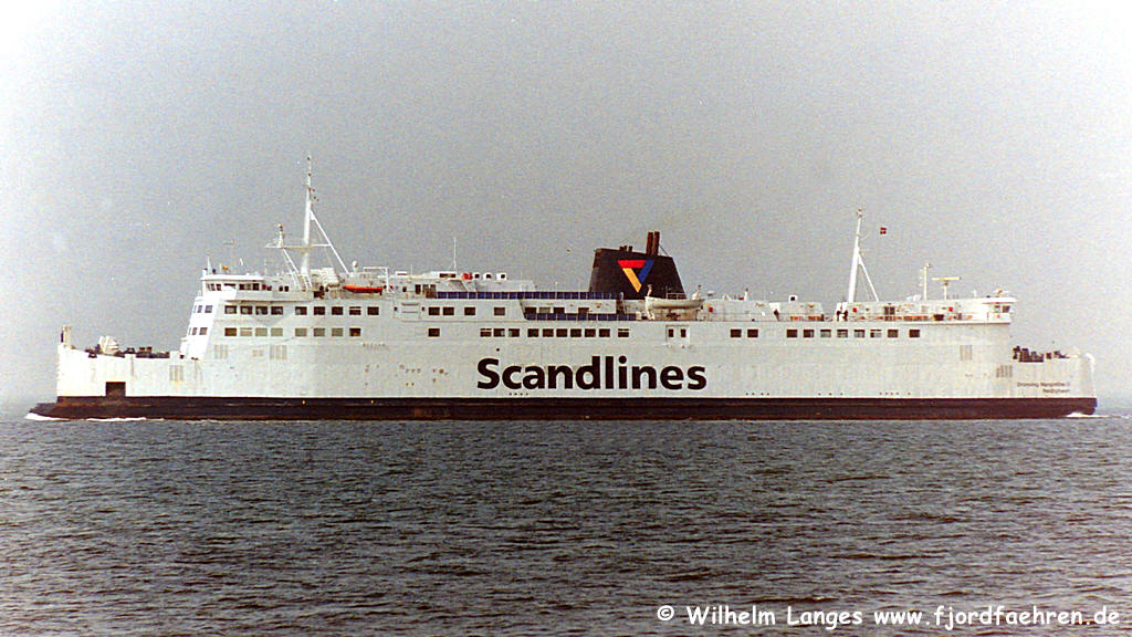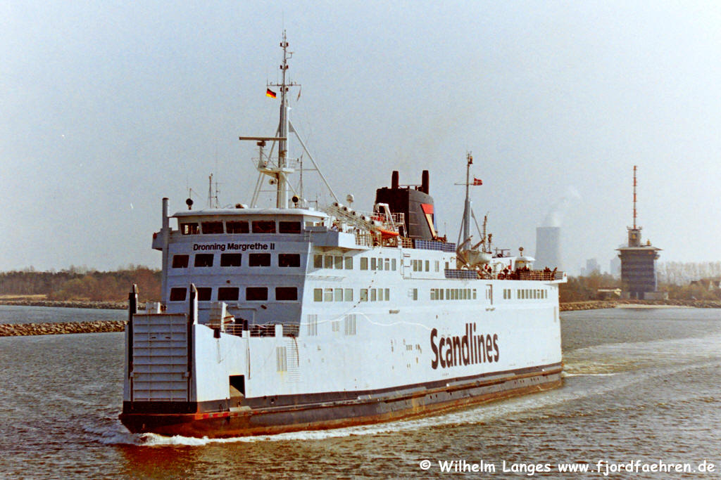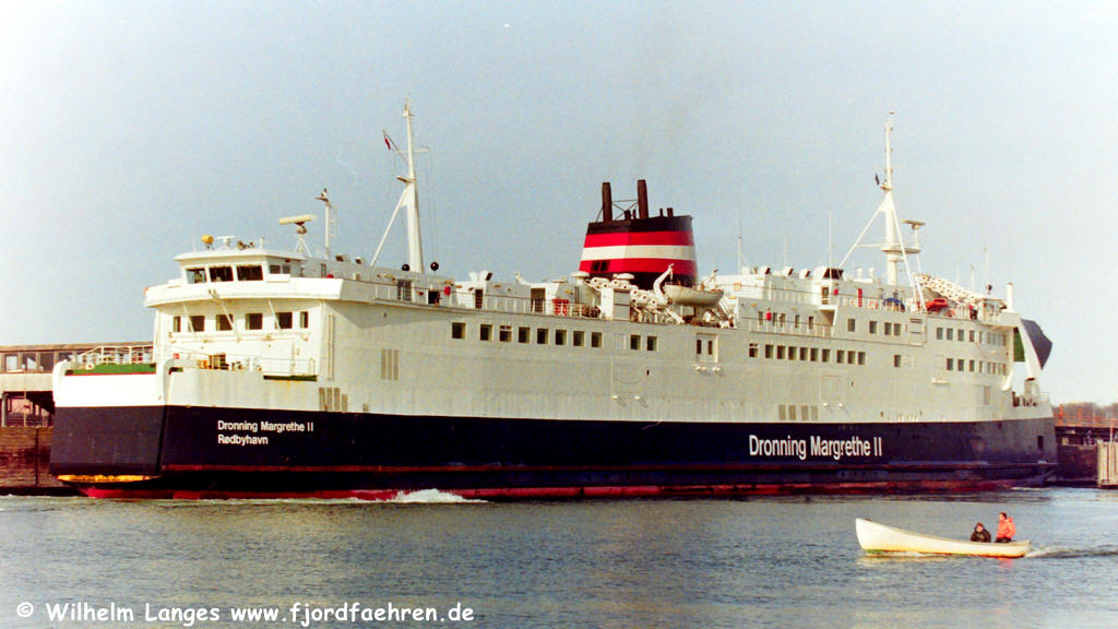 MARGRETHE II" Auftragserteilung: 00.05.1970 Kiellegung: 06.10.1972 Stapellauf: 14.03.1973 Ablieferung: 06.12.1973 Indienststellung: 06.12.1973 Bauwerft: Nakskov Skibsværft A/S., Nakskov Baunummer: 200 BRT: 5623 NRT: 2696 TDW: 1575 Länge: 132,66 Breite: 17,71 Tiefgang: 4,63 Knoten: 18,50 PS: 12000 KW: 8820 Antrieb: B & W- Diesel Besatzung: 29 Passagiere: 1500 PKW: 260 Waggons: 30 Registernummer: A 54 Signal: OUIX Neue Daten ab 1982: BRT: 6211 NRT: 4020 TDW: 2275 BRZ: 10850 NRZ: 3255 Länge: 144,66 Breite: 17,71 Tiefgang: 4,80 Passagiere: 1286 PKW: 211 Daten: Jürgen Stein, Hamburg = Ergänzungen |