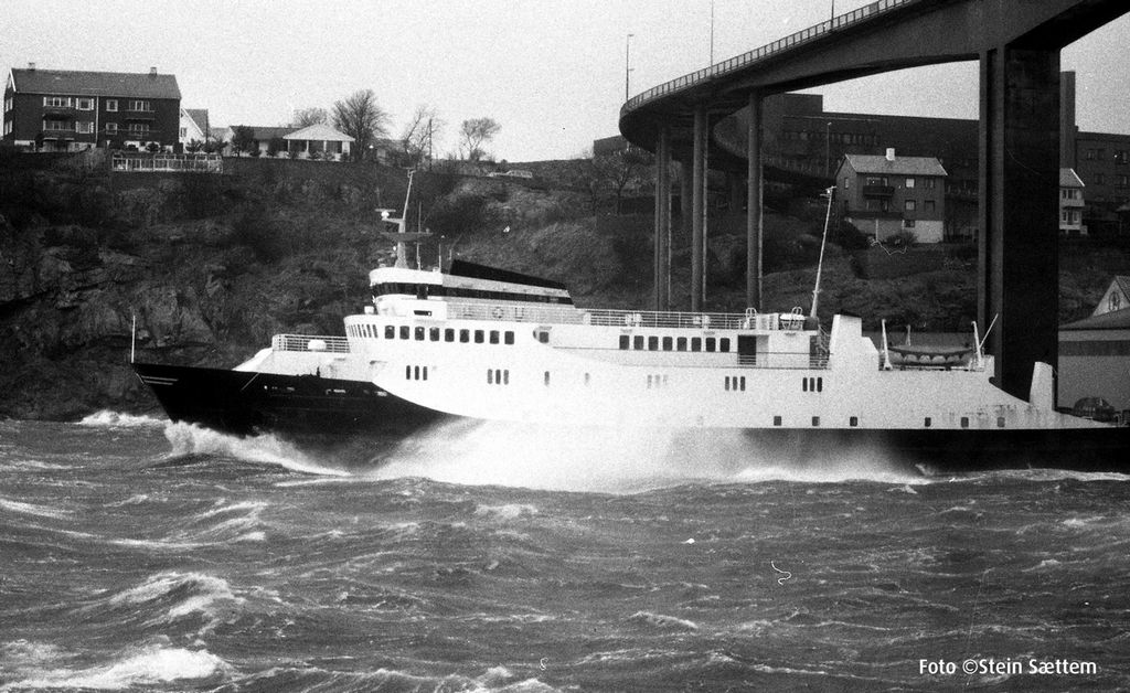 ![]() "Bolsøy" på vei ut Sørsundet i Kristiansund i rute mot Bremsnes en stormfull høstdag i 1990. |
