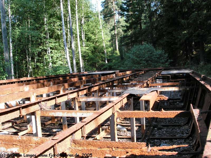 ? - 1995 ? Gebrauch als Leichter ("brukt som lekter") sollte restauriert werden seit 1995 aufliegend Svartevik / Kroksund "am Ende einer kleinen Bucht des Rødessjøen, südwestlich der Kroksund-Brücke ca. 100 m vom RV 123 / ved enden av Svartevik / Rødenessjøen, sørvest Kruksund-bru ca. 100 m fra RV 123) |