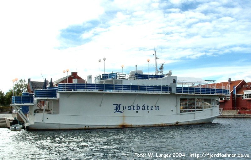 1966 - ? Sommerroute Brimnes - Bruravik 1967 - 1970 Gjemundshamn - Varaldsøy- Løfallstrand ? - ? Fjelberg - Utbjoa - Leirvik Plan 1976: Siggjarvåg - Sagvåg 1977; 1979 - 1984: Flatråker - Huglo - Jektevik ? - ? Bjorøy - Alvøen ? - 1995 Tørvikbygd - Jondal - diverse Routen Sunnhordland als Extra-/Reservefähre 1996 - 2000 Restaurantschiff Aker Brygge, Oslo 2000 - 2008 Restaurantschiff "Lystbåten" in Moss, nahe dem Anleger der Bastø-Fähren nach Horten - 26.10.2008 im Hafen von Moss gesunken Infolink Moss Dagblad Infolink Moss Avis - Ende Februar 2009 gehoben moss-avis.no - 2009 - 2010 aufliegend in Moss - zwischenzeitlich im Eigentum der "Rygge Vaaler Sparebank 1 Moss", aber 03.2009 zurückgekauft - 09.2010 nach Horten geschleppt, später bei Drammen Slipp in Drammen gesichtet - 2012 - 2014 in Lierstranden bei Drammen aufgelegen - 10.2014 nach Ausfall der Lenzpumpen dort gesunken - Abbruch geplant - per 11.7.2017 aus Register gestrichen |