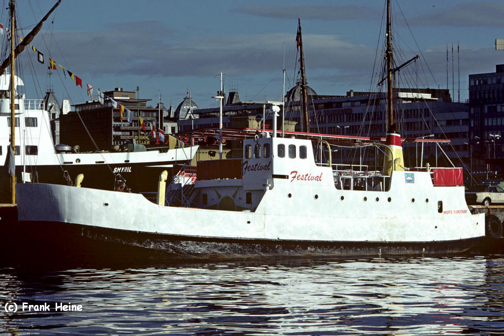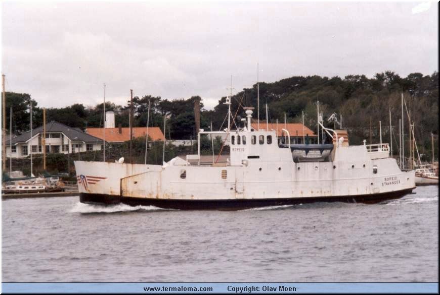 - 08.1973 Ropeid - Sand ca. 1973 Einbau einer hydraulischen Bugklappe 05.1974 - 1981 / 1982 - 04.1984 "Tverrsamband": Jelsa - Hebnes - Foldøy - Nedstrand 1981 - 1982 aufgelegt 1984 - 1987 aufgelegt, Reservefähre 10.1987 verkauft 1987 - 1990 unklar 1990 Umbau zum Passagierschiff Sommer 1990 Ausflugsschiff von Flåm / Aurland ca. 1990 - ca. 2022 Ausflugsschiff / Charterschiff Oslo (Rådhusbrygge) 1.2.2023 aus NOR gestrichen´und verkauft 03.2023 nach Dänemark - Renovierung in Skagen/Frederikshavn kein Eintrag im dänischen Register (29.8.2024) 11.2024 im Hafen Ålbæk liegend Maschinenraum und Brücke ausgeräumt, wird wohl zum Hausboot umgebaut, 28.5.2025 aus Ålbæk Richtung Sjælland weg geschleppt |