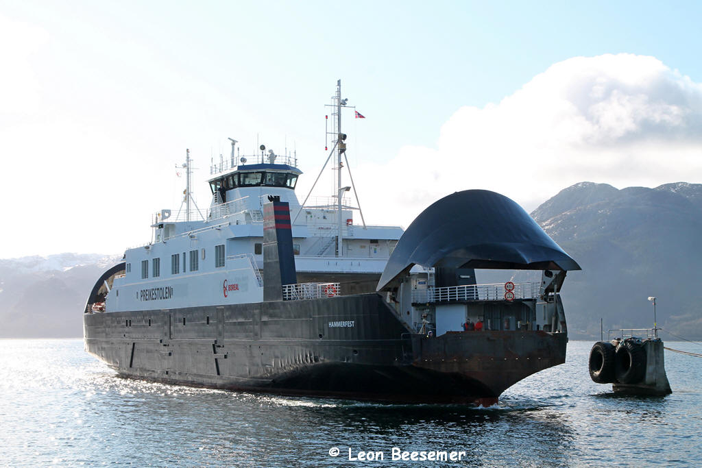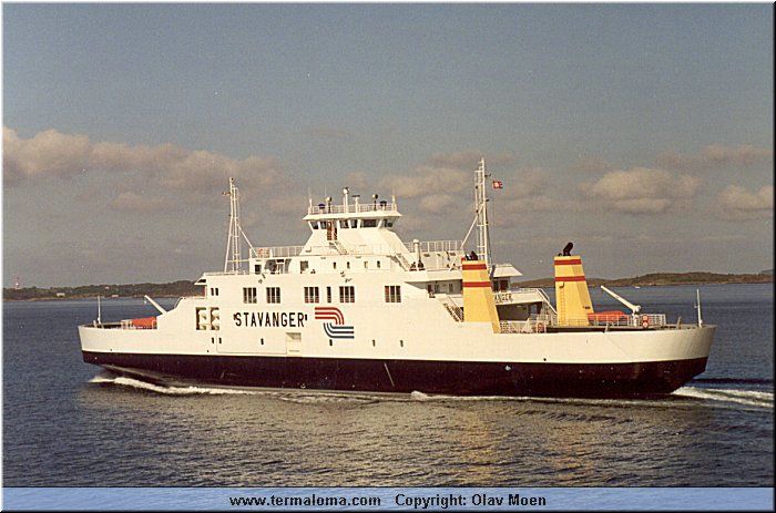 - 2001 - 01.2007 Halhjem - Sandvikvåg - 2007 - 2008 Skjersholmane - Ranavik - Sunde - 2008 Reservefähre - 09.2008 - 10.2009 Ålesund / Flatholmen - Valderøya, nur in Abend-/Nachstunden bei Renovierung der Tunnelverbindung - 01.2010 - 12.2013 Stavanger - Tau 01.2014 - ca. 11.2014 Skjersholmane - Ranavik 12.2014 - ca. 04.2015 Leirvåg - Sløvåg Reservefähre: - z.B Sommer 2016 Lavik - Oppedal / - Årsnes - Gjermundshamn (2018) - 2017 - 2019 Reservefähre Lavik - Oppedal - 10.2019 an Boreal Sjø verkauft - 11./12.2019 nochmals Reserveeinsatz Stavanger - Tau und Lauvvik - Oanes 30.12.2019 um 12.00 Uhr: letzte Fahrt Stavanger - Tau 1.1. - 20.3.2020 private Fährverbindung: Lauvvik - Oanes, am 20.3.2020 u.a. wegen der Corona-Krise aufgegeben 04.2020 - ... Reservefähre 1.1.2021 - ca.06.2021 Molde - Vestnes 10.2022: zum Verkauf stehend aufliegend Stavanger per 19.4.2025 verkauft |