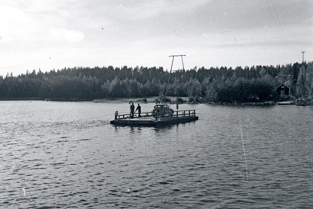 ![]() Hellnäs sund, en lastbil på den handdrivna färjan. 1950er - https://www.finna.fi/ Erik Hägglunds fotosamling |