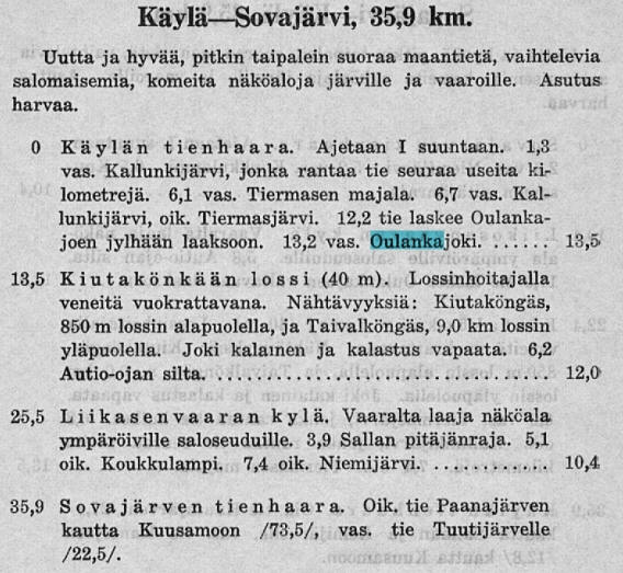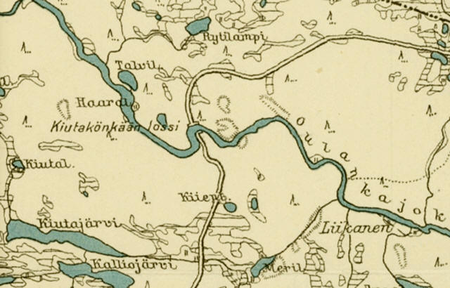 | Kiutavarra / Kiutaköngäs Kiutakönkään lossi über den Oulankajoki (35/40 m) - Strasse Käylä - Liikasenvaara Fährstelle schon in Karte 1939 - Brücke ab 1953 |