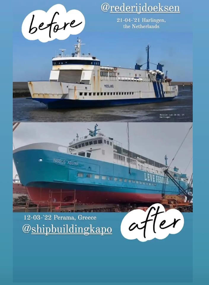 1989 Verlängerung bei Werftunion GmbH, Emden 9.12.1993 - 02.2021 Harlingen – Terschelling und Harlingen - Vlieland (zuletzt als Reservefähre) 04.2021 nach Griechenland verkauft - ab 22.4.2021 Flagge Togo - Umbau / Renovierung in Perama / Griechenland - für "Leve Ferries" Piräus - Insel Egina |