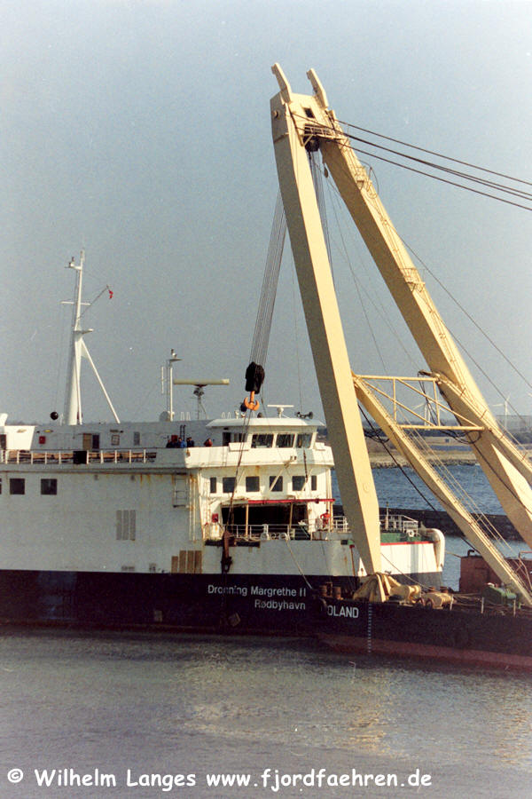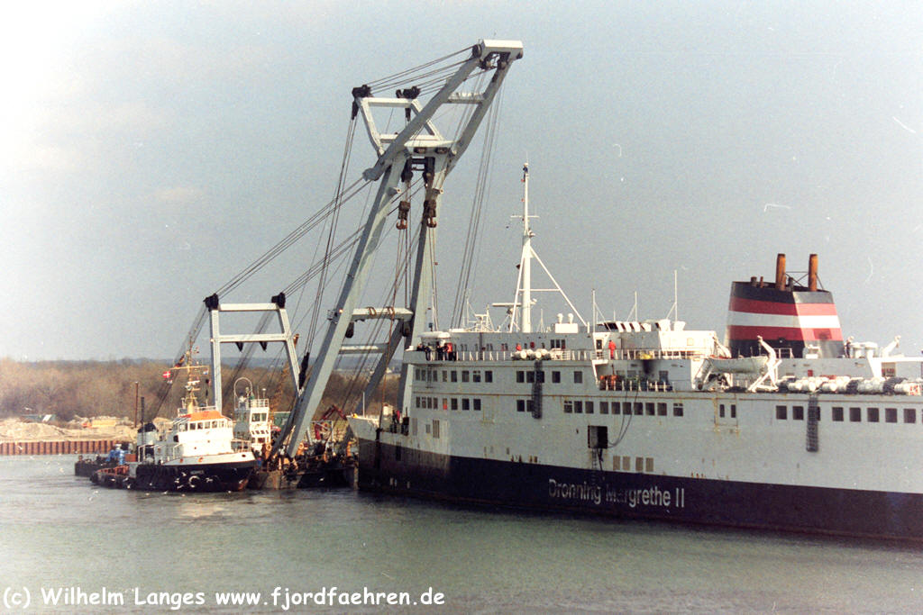 MARGRETHE II" Auftragserteilung: 00.05.1970 Kiellegung: 06.10.1972 Stapellauf: 14.03.1973 Ablieferung: 06.12.1973 Indienststellung: 06.12.1973 Bauwerft: Nakskov Skibsværft A/S., Nakskov Baunummer: 200 BRT: 5623 NRT: 2696 TDW: 1575 Länge: 132,66 Breite: 17,71 Tiefgang: 4,63 Knoten: 18,50 PS: 12000 KW: 8820 Antrieb: B & W- Diesel Besatzung: 29 Passagiere: 1500 PKW: 260 Waggons: 30 Registernummer: A 54 Signal: OUIX Neue Daten ab 1982: BRT: 6211 NRT: 4020 TDW: 2275 BRZ: 10850 NRZ: 3255 Länge: 144,66 Breite: 17,71 Tiefgang: 4,80 Passagiere: 1286 PKW: 211 Daten: Jürgen Stein, Hamburg = Ergänzungen |