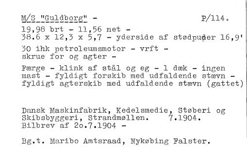 Guldborg - P 114 im Volksmund genannt : "Loppen" - beim Bau: 30 PS Petroleummotor - ab 1908 neuer 24 PS-Petroleummotor ( Forenede Maskinfabrikker, Nakskov) - ab 1917 neuer Motor von Maskinfabrikken Hera, København - ab 1929 vierter Motor - Eintrag in "Danske Krigs- og Handelsskibe" (Danmarks Skibsliste) nur für 1905, 1907 - auf dieser Seite Info wird noch Skibsreder Alfred Christensen als Eigner angegeben. Lt. Info von Sakskøbing lokalarkiv war Maribo Amtsraad Eigner bis 1934, dann Bøgh |