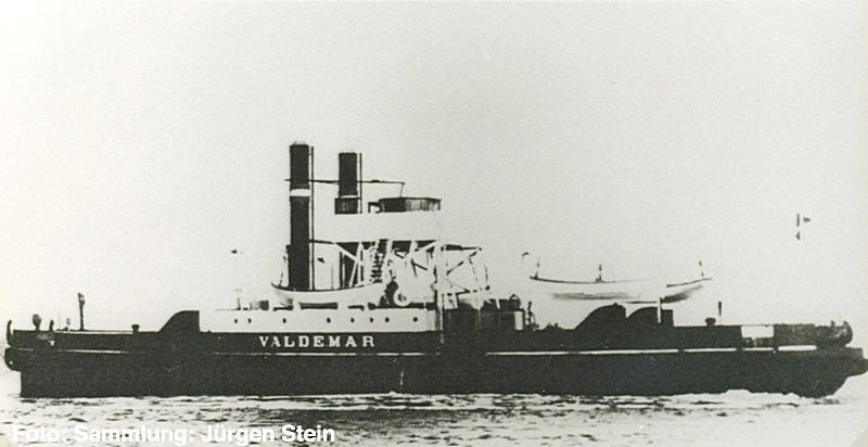 - Liniendienst: 00.04.1886 - 00.00.1890: Fredericia - Strib 00.00.1890 - 00.00.1893: Oddesund Nord - Oddesund Syd 00.00.1893 - 00.00.1905: Masnedø - Orehoved 00.00.1905 - 00.00.1919: Fredericia - Strib 00.00.1919 - 15.05.1938: Oddesund Nord - Oddesund Syd 16.05.1938 - 01.07.1938: Kein Liniendienst Am 01.07.1938 wurde die "VALDEMAR" an Statens Istjeneste, København verkauft worden. - 1938 Umbau bei Aalborg Verft; jetzt 350 brt, 96 nrt - Eisbrecher; stationiert in Glyngøre/Limfjord - abgebrochen 7.5.1960 bei K.D. Løgstrup, Randers. |