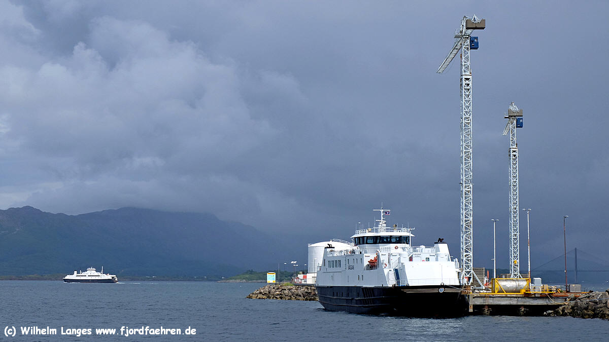 ![]() ![]() aufliegend in Sandnessjøen 16.7.2017 - noch mit MRF-Logo am Bug und nur mit Torghatten Flagge ! |