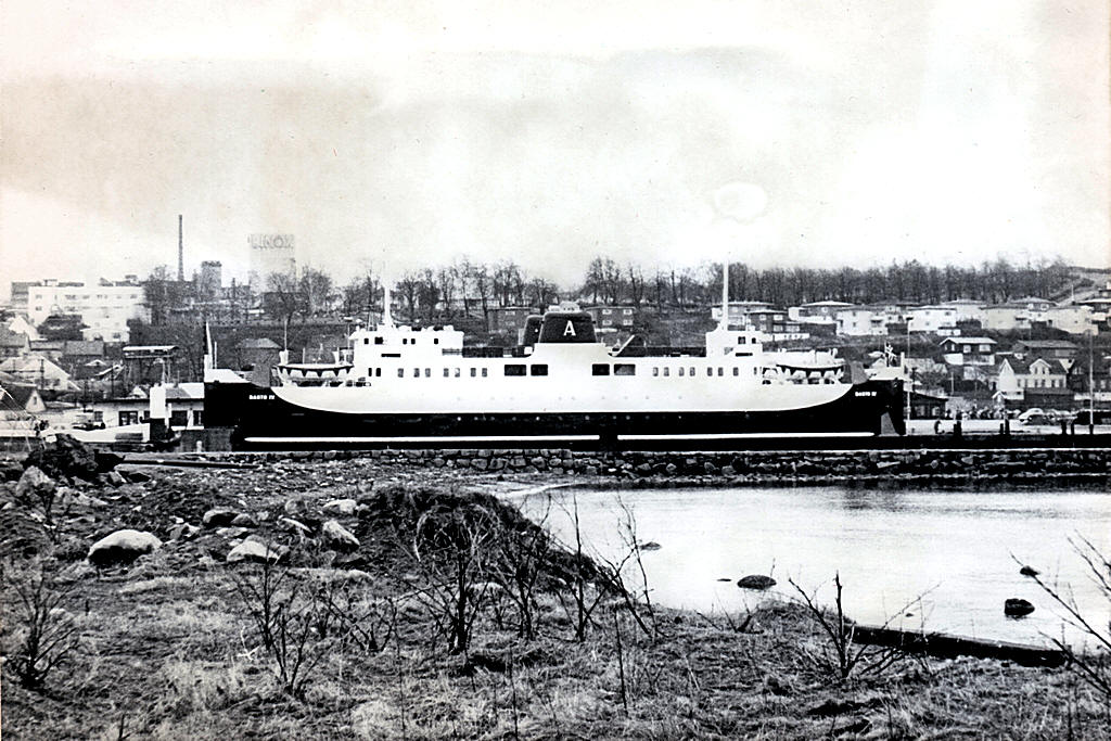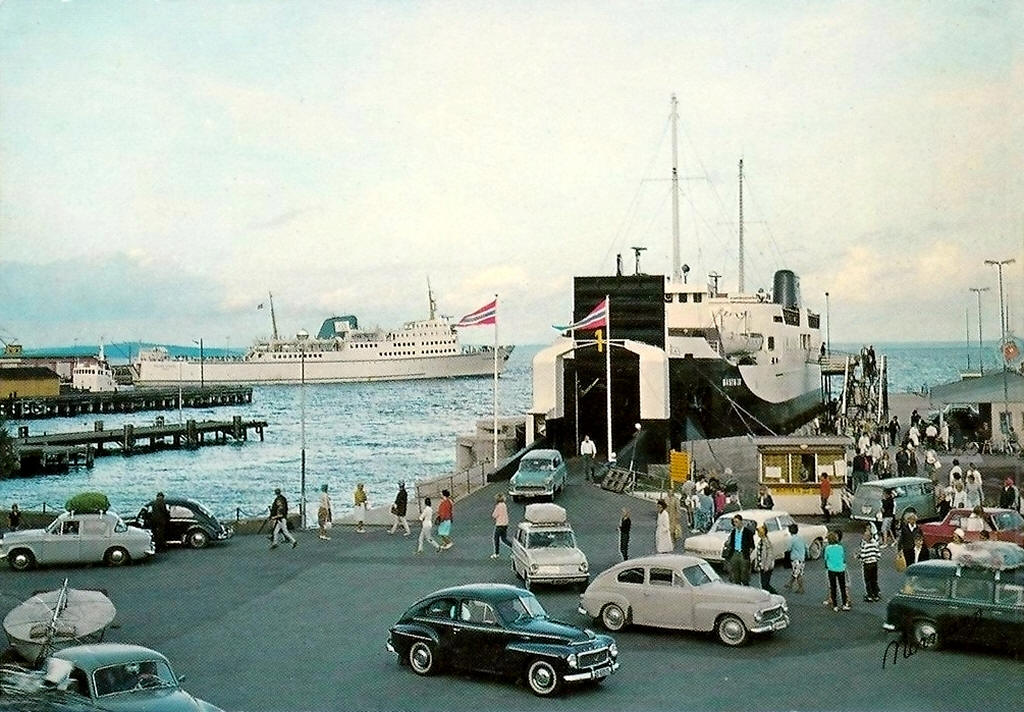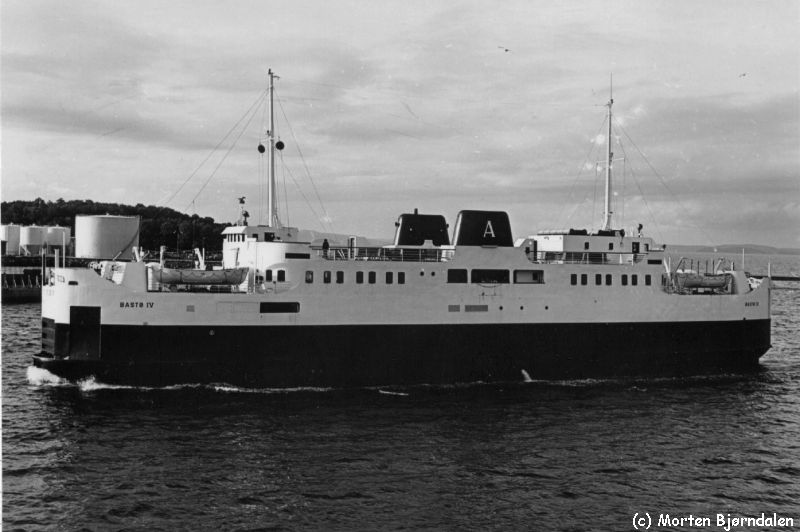 ![]() Bastø IV Anfang 1970er in Horten - links die Dänemarkfähre "Holger Danske", die bis ca. 1973 auf der Verbindung Oslo - Århus auch Horten anlief. |