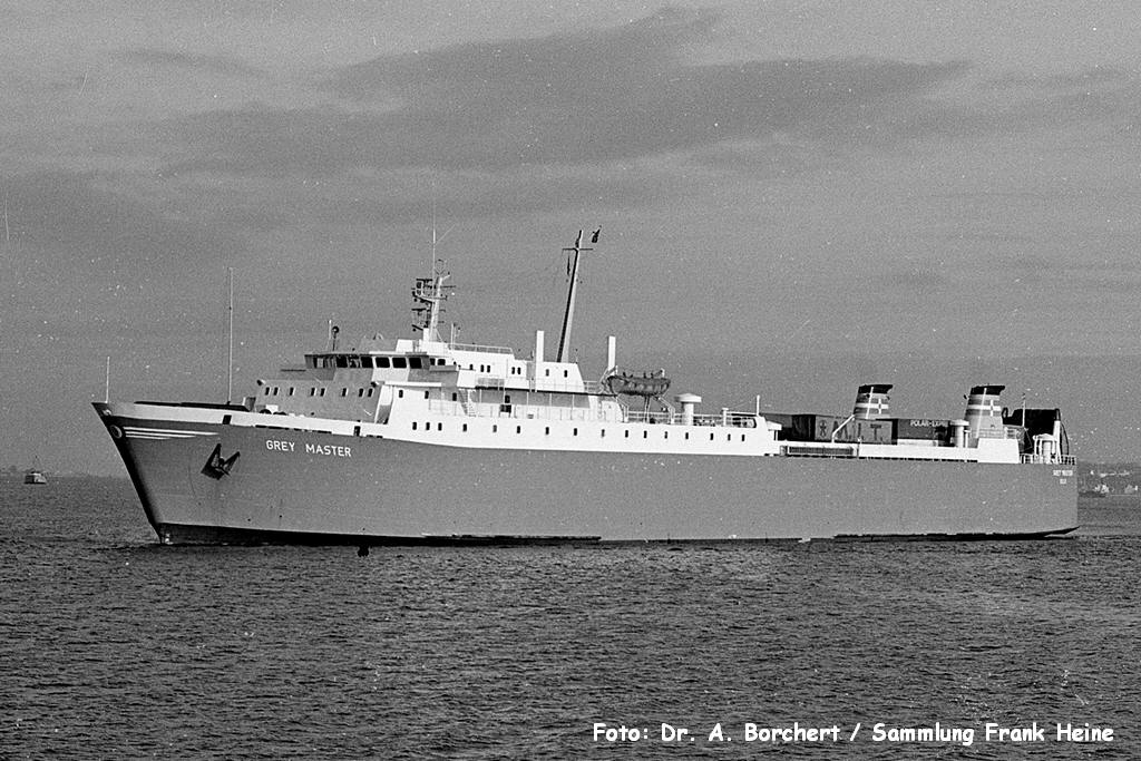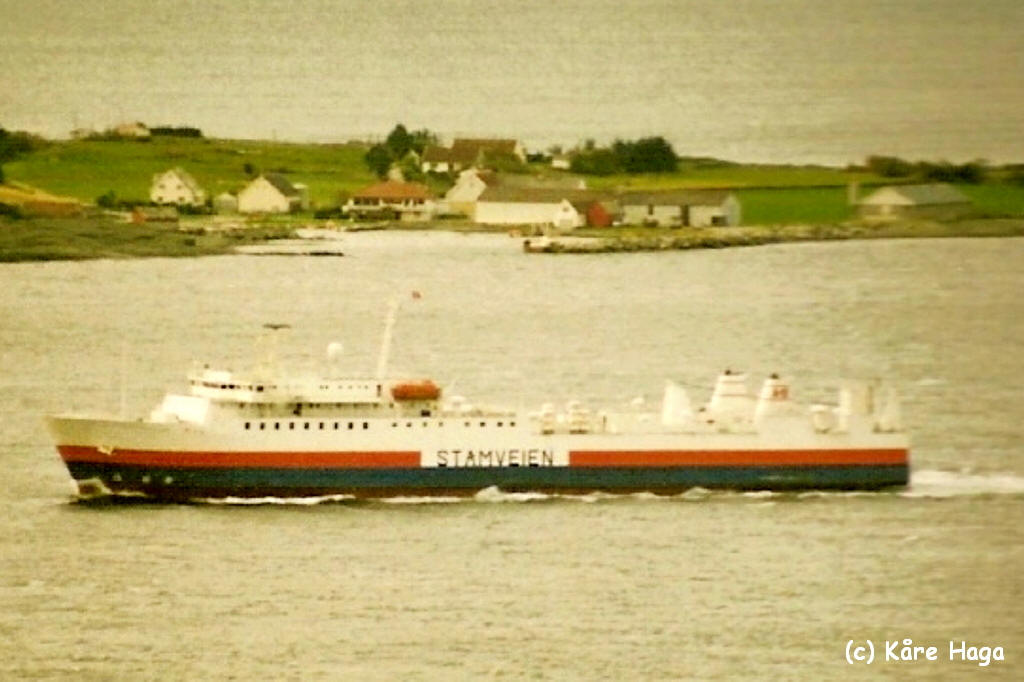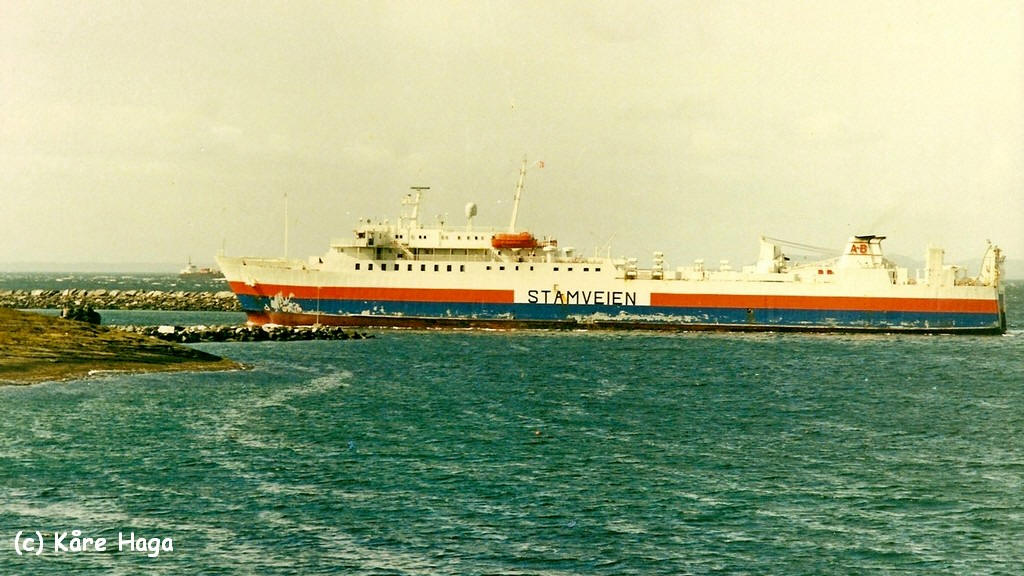 1973 - 1974 diverse kurzfristige Vercharterungen 1974 - 1978 Ellesmere Port - Tartous - Beirut - Piräus - Mersin - Limassol (für Car-Line Paris Cie., Paris) 1978 - 1980 diverse kurzfristige Vercharterungen 1980 - 1982 Neapel - Tripolis (für Neptunia Lines SPA, Neapel) 1983 - 1987 Britisches Verteidigungsministerium - "Falkland Task Force"; meist im Einsatz Marchwood (GB) - Antwerpen (B) 1987/1988 Umbau zur Passagier-/Frachtfähre bei Fosen Mek. Verksted, Rissa 1988 - 1992 Skudneshavn - Mekjarvik/Stavanger 1992 Mekjarvik - Arsvågen 1992/1993 aufgelegt 1993 Krokeide/Bergen - Mekjarvik 1993/1994 aufgelegt 1994 - 2002 Dalian - Vantai (China) 2002 - 2006 Singapore stationiert in Merak (Insel Java), Indonesien (Info 12.2017) |