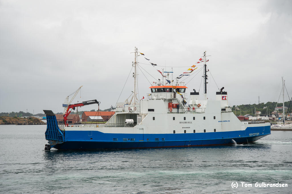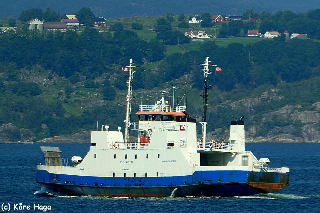 ![]() "Rygerfjell har fått det travelt på sine gamle dager. Som reserveferje for Vassøyferjen og tirsdagsrute til Byøyene går den nå hele dagen, hele uken som Ryfylkeferjen med start/stopp på Nedstrand. Bilde fra Judaberg 14.7.2021 |