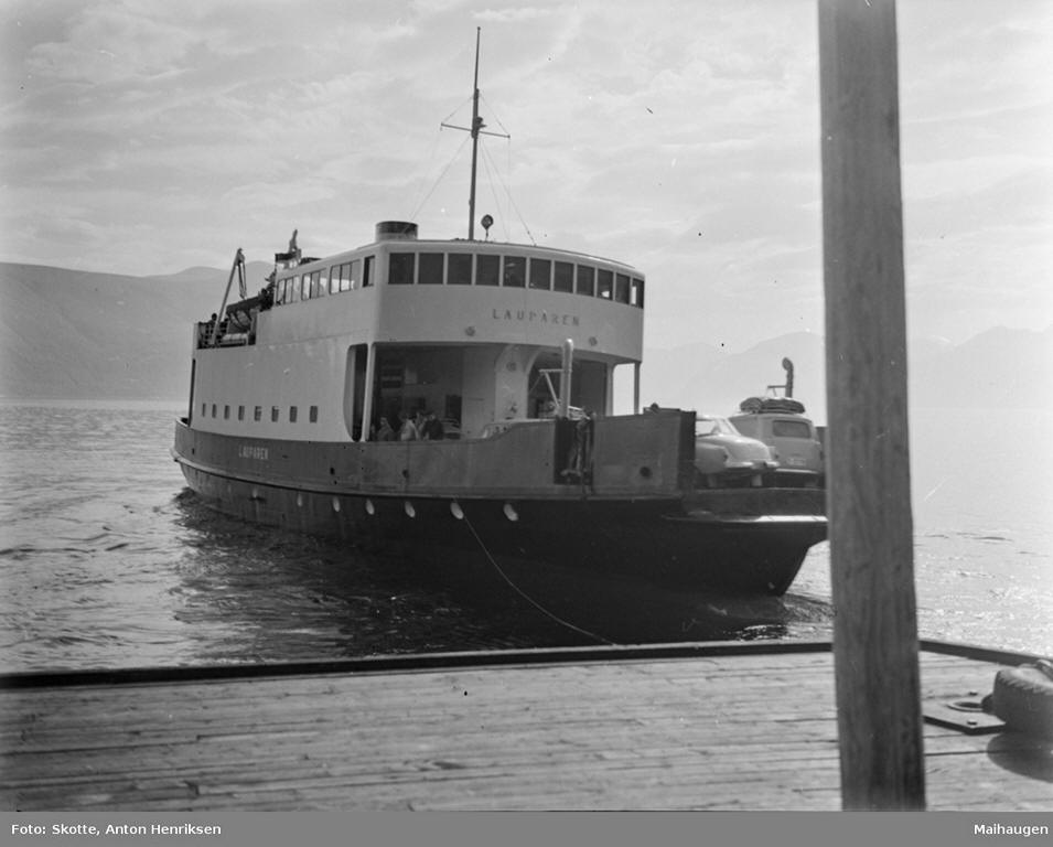 ![]() "Lauparen" ble bygd i 1950 som søsterskip til "Gjemnes" (I). I 1970 ble overbygget fjernet og ferja fikk rorhus på siden. (Foto: ukjent) |