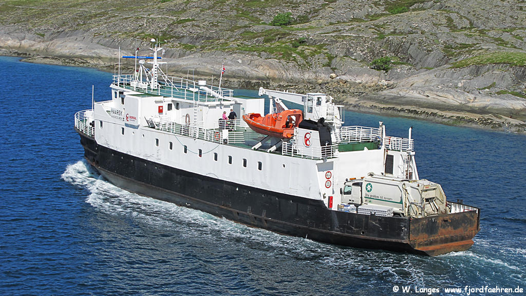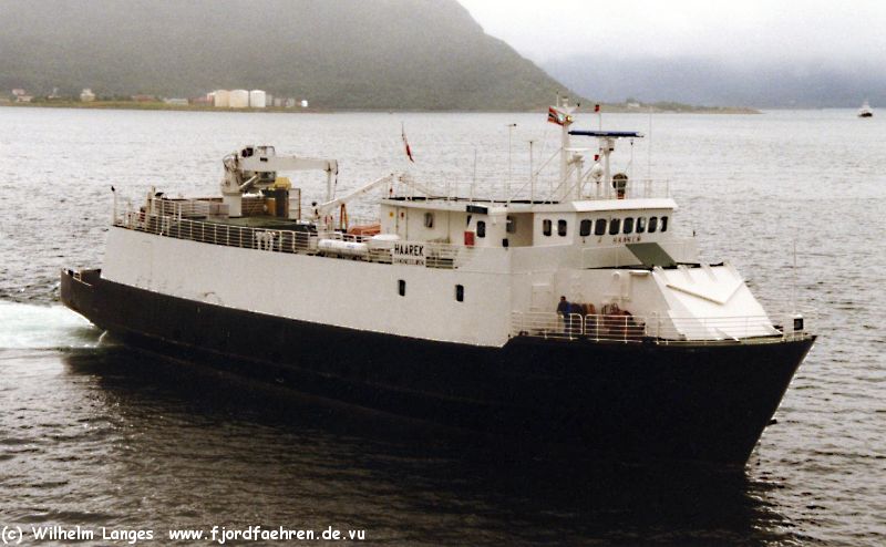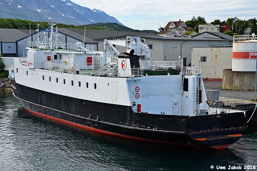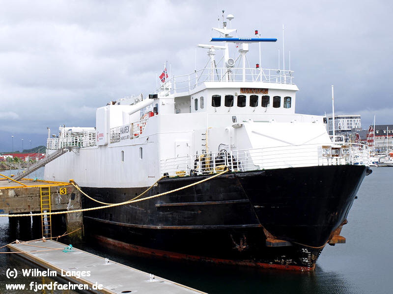 1993 Umbau und Verlängerung bei Bugen Verft, Kyrksæterøra, N 1993 - ca. 03.2014 (Sandnessjøen) - Stokkvågen - Lurøysteder - Selvær - Træna (komb. Fähr-/Frachtroute) 2014 - 2017 Reservefähre Hammerfest: z.B. Øksfjord- Hasvik / Øksfjord- Bergsfjord- Tverrfjord- Sør- Tverrfjord 07.2017 aufliegend Sandnessjøen Sommer 2018/2020: Sømes - Hundåla - Vikdal - Mosjøen bis 26.2021 - ... Reserveeinsätze, Sandnessjøen Reserveeinsatz Tjøtta- Forvik 03.2021 gemeldet: verkauft in die Karibik: Verkauf annulliert 10.2021 verkauft Arbeits-Transportschiff für den Bau einer landbasierten Fischaufzuchtanlage nahe Rødøya in der Rødøy-kommune: Indre Rosøya |