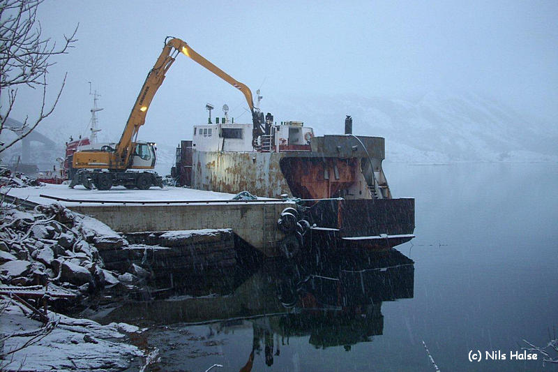 ![]() ![]() Samboer'n ex. Nordmøre bei Fosen Gjenvinning am 12.1.2011: der Abbruch der Fähre hat begonnen Fotos: Nils Halse |