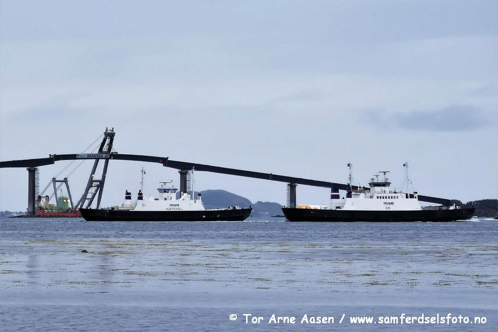 ![]() LEPSØYBRUA montert av UGLEN - Noregs største flytekran: Igår vart siste del av Lepsøybrua på den nye Nordøyvegen montert. Brua er sett saman av sju stålmodular, der midtdelen på 155 meter utgjer det lengste spennet på ei stålbru i Noreg. Under denne går hovudskipsleia over Lepsøyrevet, noko som gjer at brua har fått god seglingshøgd på 41 meter. Nordøyvegen vil ved opninga hausten 2022 gjere Lepsøya, Haramsøya, Flemsøya, Fjørtofta og Harøya landfast. Idag er øyane forbunde av fire ferjer på to samband. Nærast brua ligg sambandet Skjelten-Lepsøya-Haramsøya som trafikkerast av Austevoll og Os, her avbilda i historiske augneblinkar med brua som vil gjere dei arbeidslause. Text: Tor Arne Aasen / www.samferdselsfoto.no |