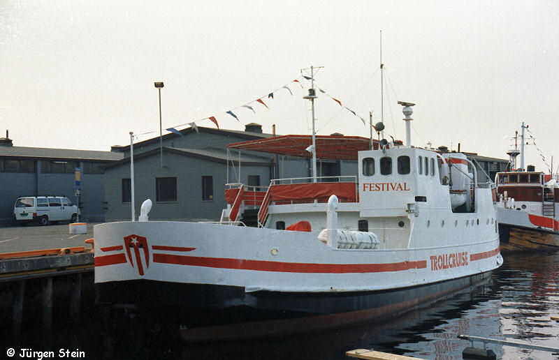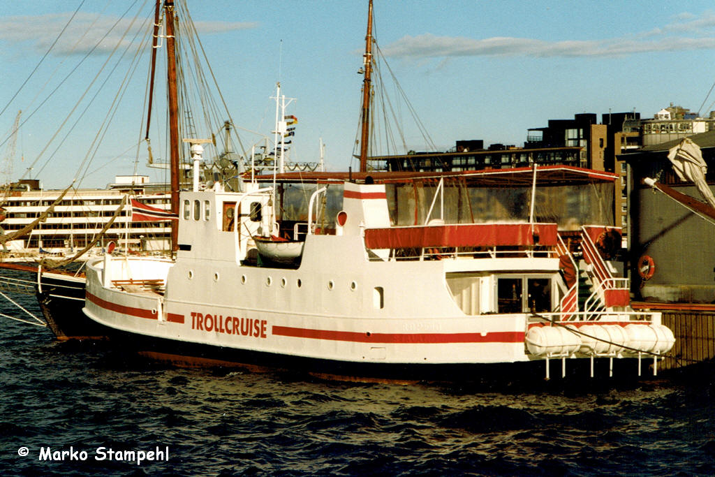 - 08.1973 Ropeid - Sand ca. 1973 Einbau einer hydraulischen Bugklappe 05.1974 - 1981 / 1982 - 04.1984 "Tverrsamband": Jelsa - Hebnes - Foldøy - Nedstrand 1981 - 1982 aufgelegt 1984 - 1987 aufgelegt, Reservefähre 10.1987 verkauft 1987 - 1990 unklar 1990 Umbau zum Passagierschiff Sommer 1990 Ausflugsschiff von Flåm / Aurland ca. 1990 - ca. 2022 Ausflugsschiff / Charterschiff Oslo (Rådhusbrygge) 1.2.2023 aus NOR gestrichen´und verkauft 03.2023 nach Dänemark - Renovierung in Skagen/Frederikshavn kein Eintrag im dänischen Register (29.8.2024) 11.2024 im Hafen Ålbæk liegend Maschinenraum und Brücke ausgeräumt, wird wohl zum Hausboot umgebaut, 28.5.2025 aus Ålbæk Richtung Sjælland weg geschleppt |