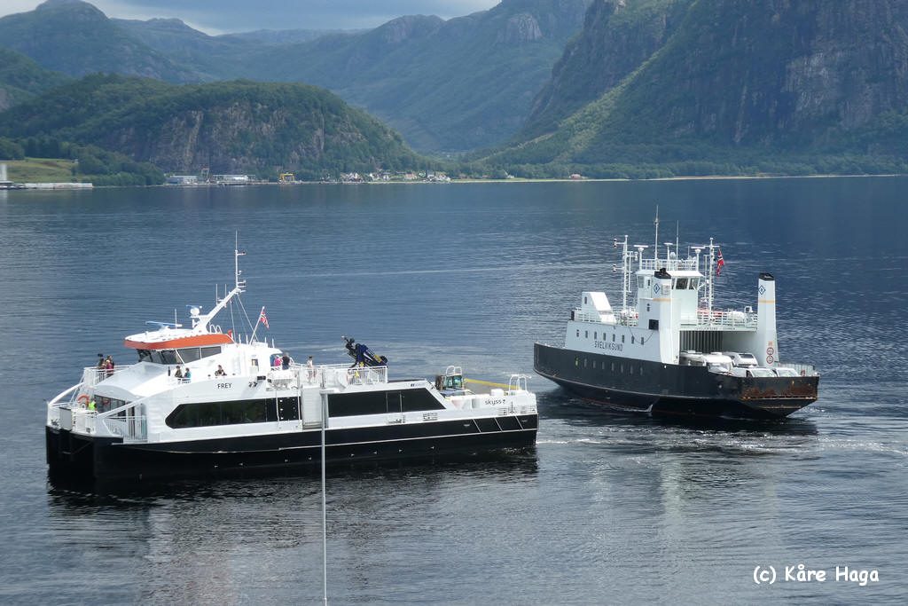 ![]() 24.7.2023 - Lauvik: "Svelviksund" måtte vente litt før "Frey" skiftet fra ferjekaien til kaien ved siden av. |