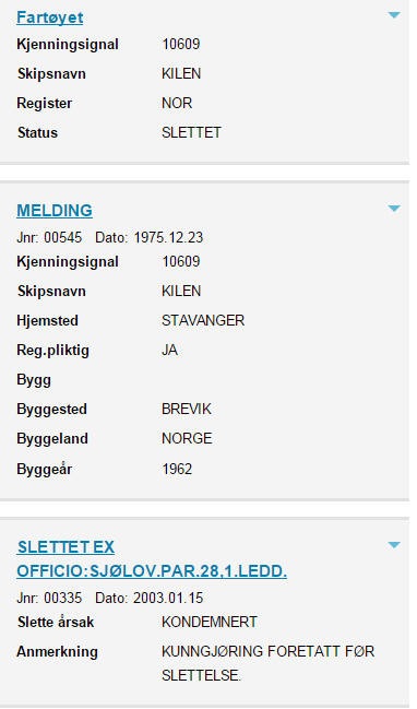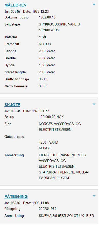 | Baujahr: 1962 Trosvik Mek. Verksted, Brevik - B.-nr: 84 - "tanklekter" Montage in Nesflaten / Suldalsvatn Eigner 1. Norsk Hydro-Elektrisk Kvælstoffaktieselskab, Oslo - 12.1975 2. Røldal-Suldal-Kraft, Nesflåten - 01.1979 3. NVE Norges Vassdrags- og Energivesen, Sand - 1995 lt. NOR per 8.11.1995 verkauft an unbekannten Eigner lt. NOR per 15.1.2003 "kondemnert" - als abgebrochen gemeldet 93,13 brt - 90,33 nrt Kennung: --- Länge: 27,76/29,6 m Breite: 7,07 m Tiefgang (dybde): 1,86 m Motor: Harbo-Master-Motor mit 26 PS (?) https://media.digitalarkivet.no/en/view/38587/743 |