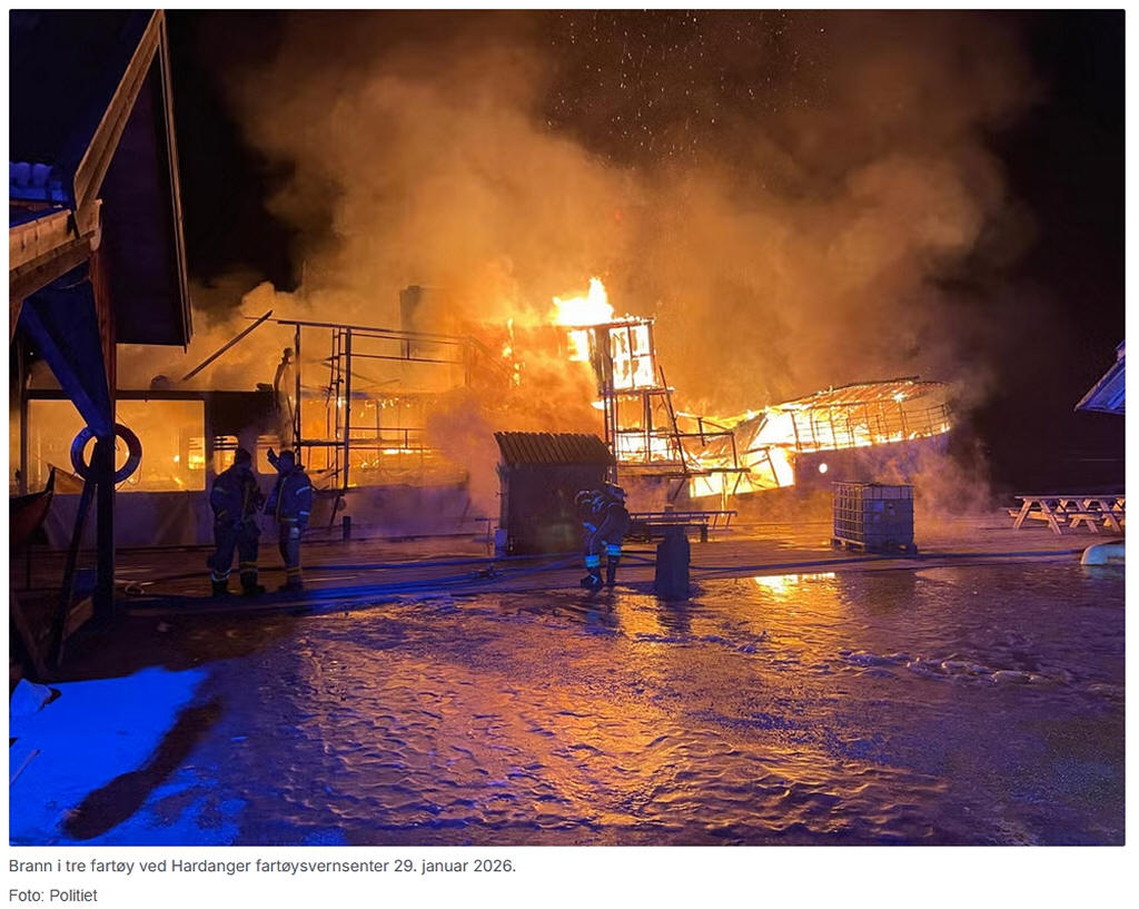![]() Jøsenfjord: Rammet av brann på Hardanger fartøyvernsenter i januar 2026. |