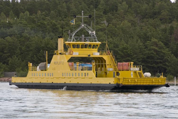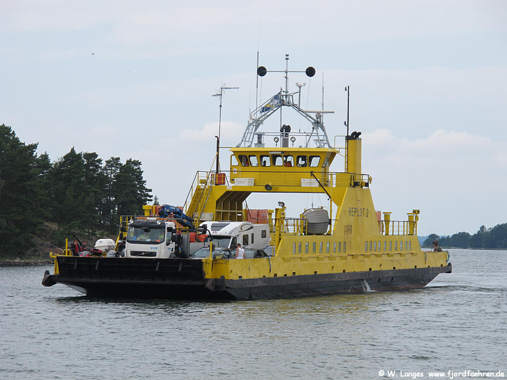 OF2244 IMO 8634766 freifahrende Fähre 4x231kW-Diesel zus. 964 kW; 309 brt / 103 nrt 130 to Tragfähigkeit Geschichte Replotfähren: Den första Replotfärjan var 27 m lång och hade en lastkapacitet på 50 ton. Hösten 1962 ersattes Replot I med Replot II. P.g.a. ökande trafikproblem och problem med vintertrafiken, togs en ny färja "Havsfågeln-Merilintu" i bruk år 1969. I mitten av 1970-talet skedde en stor förbättring när en vägbank byggdes till Fjärdskär och färjpasset forkortades då från 2,8 km till 750 m och år 1975 användes de vajerstyrda färjorna för första gången. Replotbron blev klar år 1997 och därmed hade skärgårdsborna fast vägförbindelse med fastlandet och färjtrafiken upphörde. Quelle |