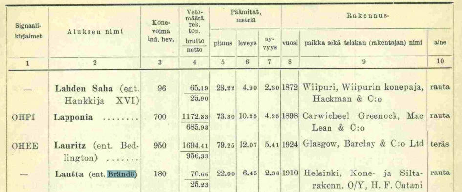 ![]() Eigner lt. Schiffsliste 1934: Pihkarnäki & Elo. Kennung SQVT Eigner: 1921: Brändö Spårvägs AB Eigner 1926: A/B Federations Stevedoring, Kotka Name schon: Lautta nicht mehr in Register ab 1934 |