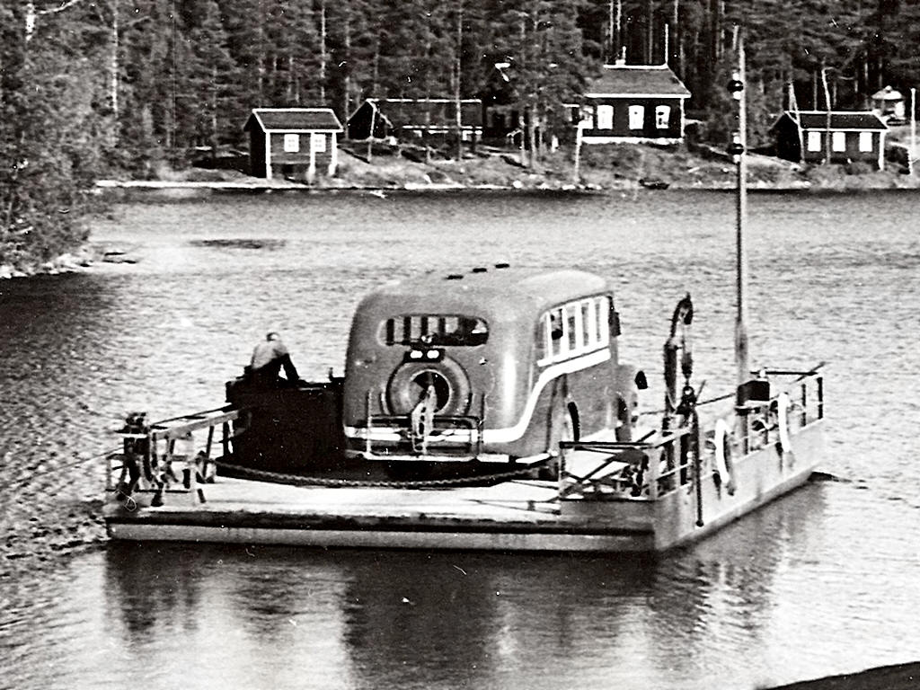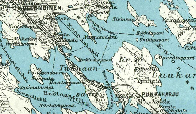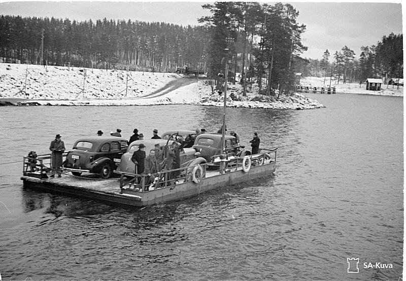 Tuunaansaari - Insel Laukansaari (über den Tuunaansalmi bei Punkaharju) -> Karte - Tuunaansalmen lossi 1. - nn: handgezogene Seilfähre, schon 1922, bis ca. 1930 2. - ? 1925 Neubau einer Fähre (?) 3. - nn: 1930 - ca. 1934 "Färjepråm / Stahl, 11,0 ml, 5,0 mb, Ahlström Oy, B.-nr: 600, Bj. 1930 4. - Motorfähre 1934 - ca. 1940 ("Tuunaansalmen moottorilossi", 12 ml,. 6 mb, 0,78 m Seitenhöhe, 10-PS-Motorwinsch, Ahlström B.-nr: 619) 1940 wurde die Eisenbahnbrücke auch für Fahrzeugverkehr hergerichtet ![]() Taloudellinen kartta 1-100.000 Savonlinna 1945 |