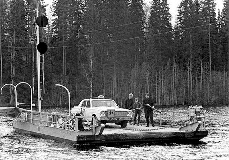 Ein Schuljunge und ein Taxifahrer helfen dem Fährmann. Bei der Fähre handelte es sich um eine 1933 gebaute Stahlfähre in Holzrahmenbauweise mit einer Tragfähigkeit von 12 Tonnen, einer Länge von 12,45 m, einer Breite von 6,25 m und einer Höhe von 0,94 m. 1958 wurde an dieser Stelle eine Stahlfähre in Holzrahmenbauweise mit Windenantrieb für 12 Tonnen installiert. Sie wurde 1969 durch eine Brücke ersetzt. https://finna.fi |